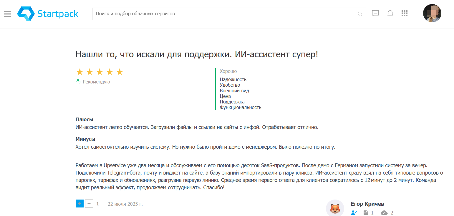 Upservice стал для компании единым центром обслуживания: все каналы собраны в одном окне, видно, кто принял заявку и на каком этапе решение. ИИ-ассистент помогает отвечать пользователям от имени разных брендов, что удобно при работе с несколькими продуктами.