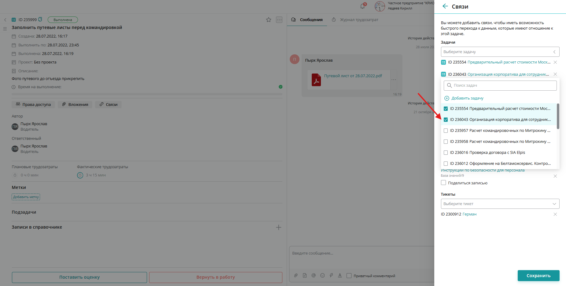 В появившемся меню свяжите задачу, например, с другой задачей. Затем нажмите на кнопку «Сохранить». Готово, связь установлена: