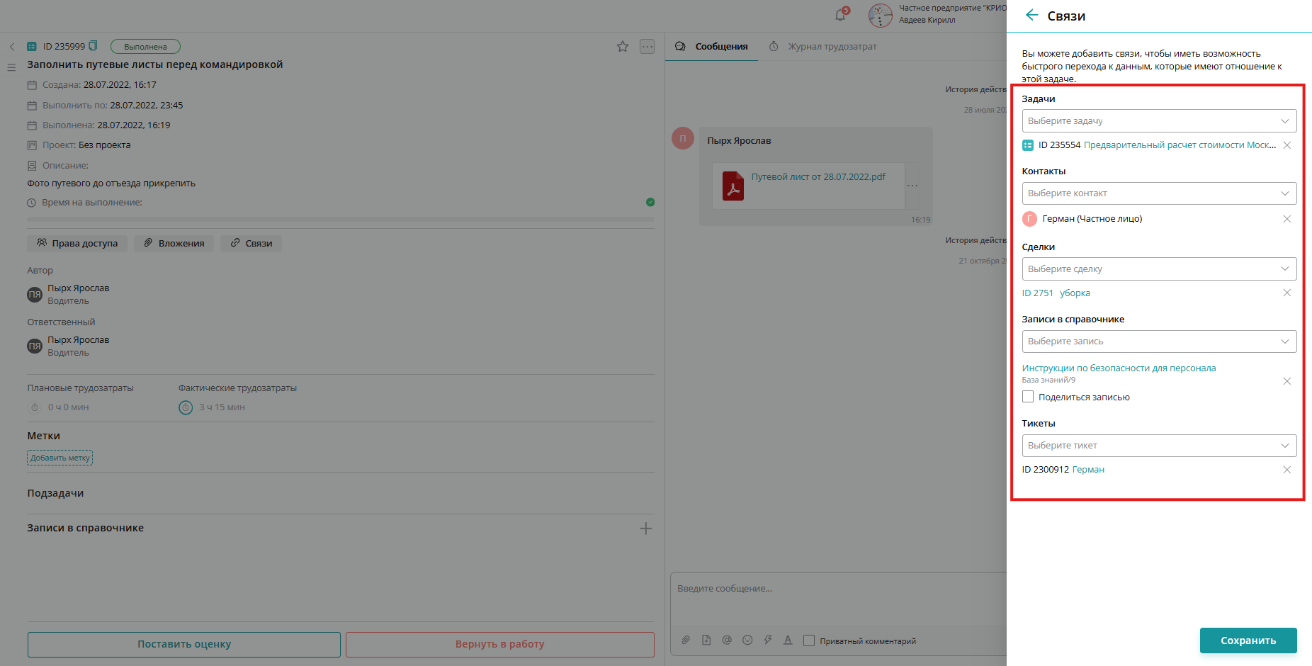 Аналогично работает создание связей для других разделов: сделки, справочники, тикеты, и т.д.