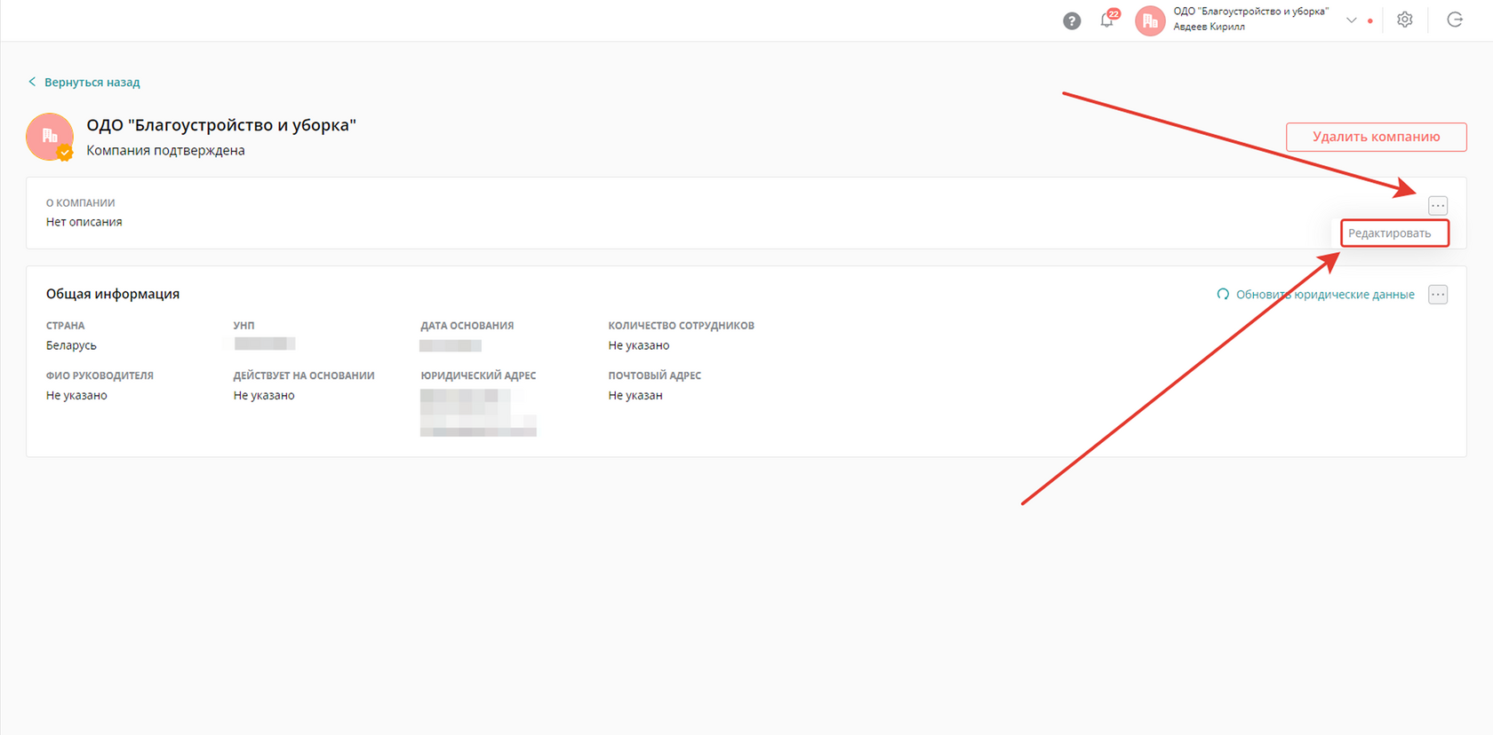 Как изменить информацию о компании