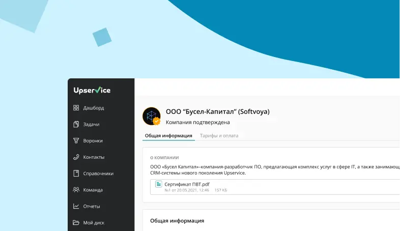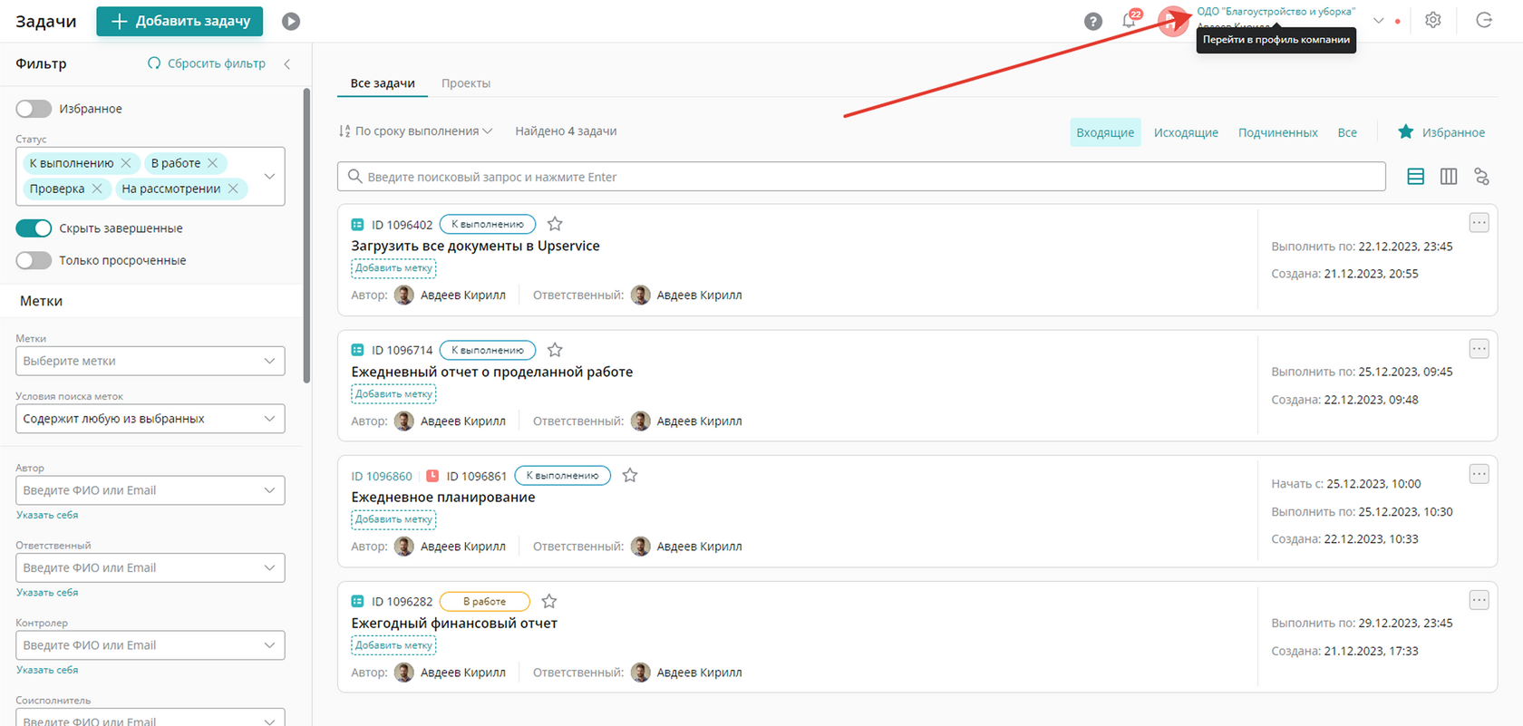 Редактирование информации о компании доступно из любого раздела Upservice. Для перехода на страницу компании нажмите на ее название в правом верхнем углу: