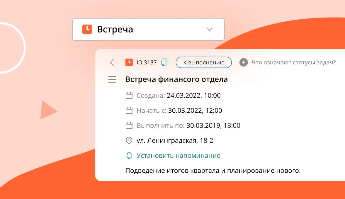- все данные о запланированных и прошедших встречах внутри задач. Если появятся вопросы, то вы всегда найдете необходимую информацию
