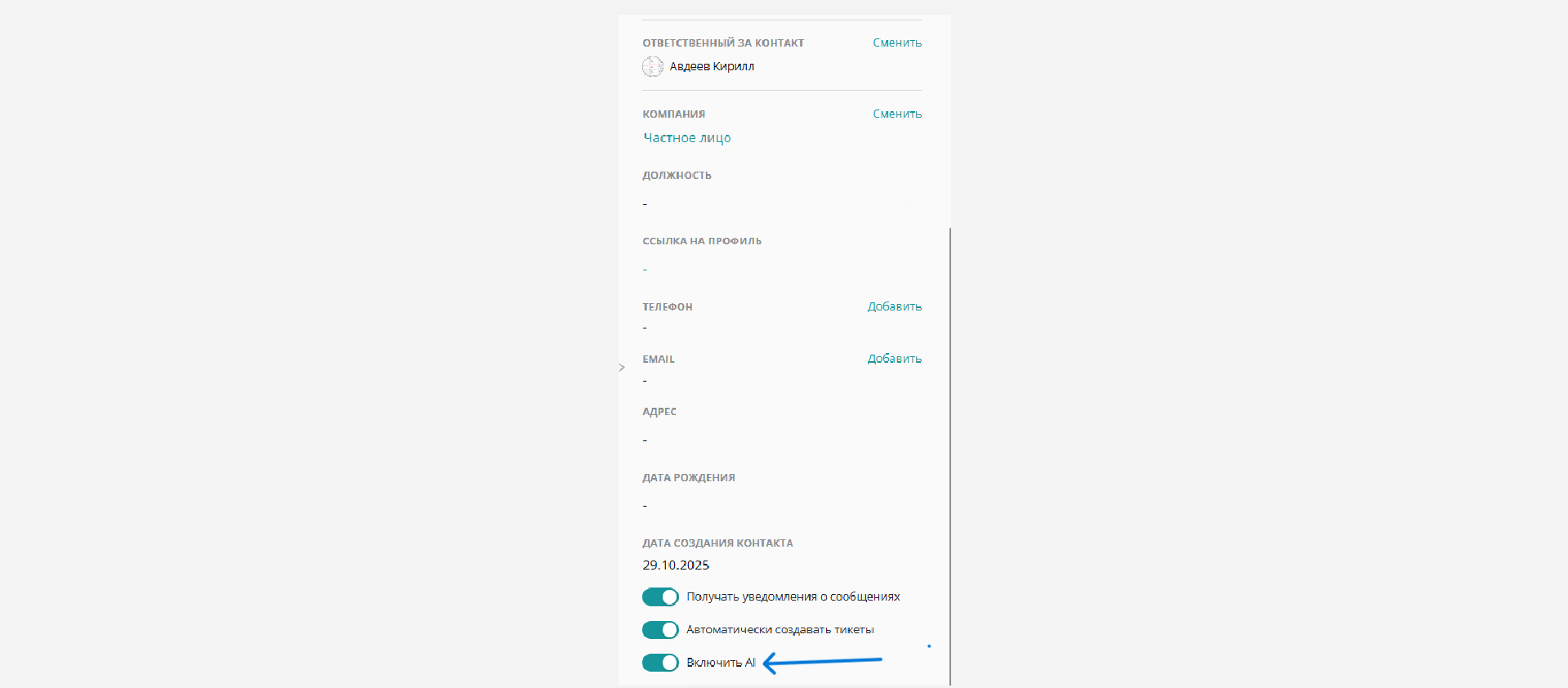 Также вы можете настроить использование AI-ассистента индивидуально для каждого контакта. Для этого переходим в сам контакт и открываем карточку контакта или Контактную информацию. Там мы увидим переключатель Включить AI: