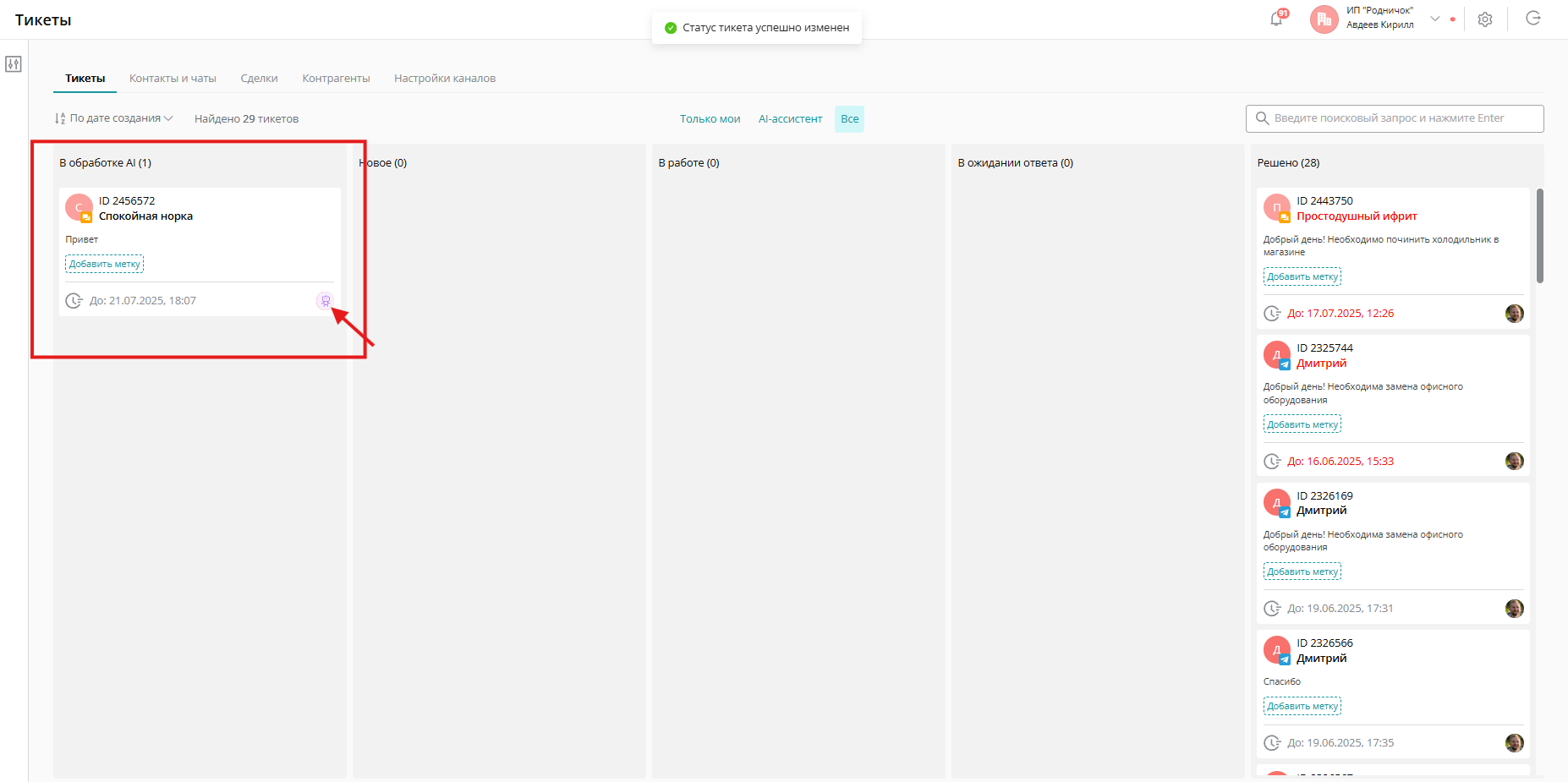 И в Upservice тикет переведется в статус Решено и ответственным останется AI-ассистент: