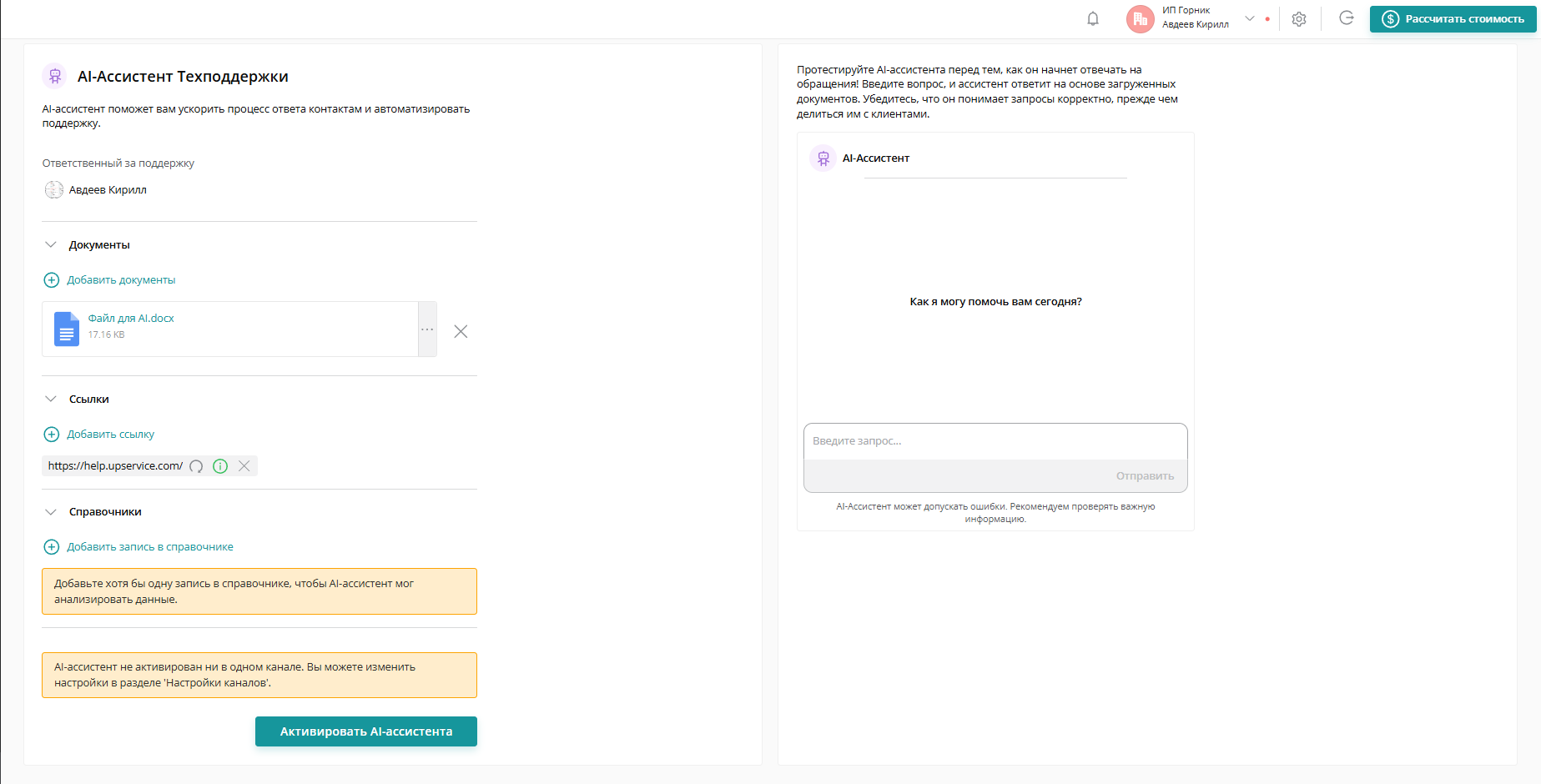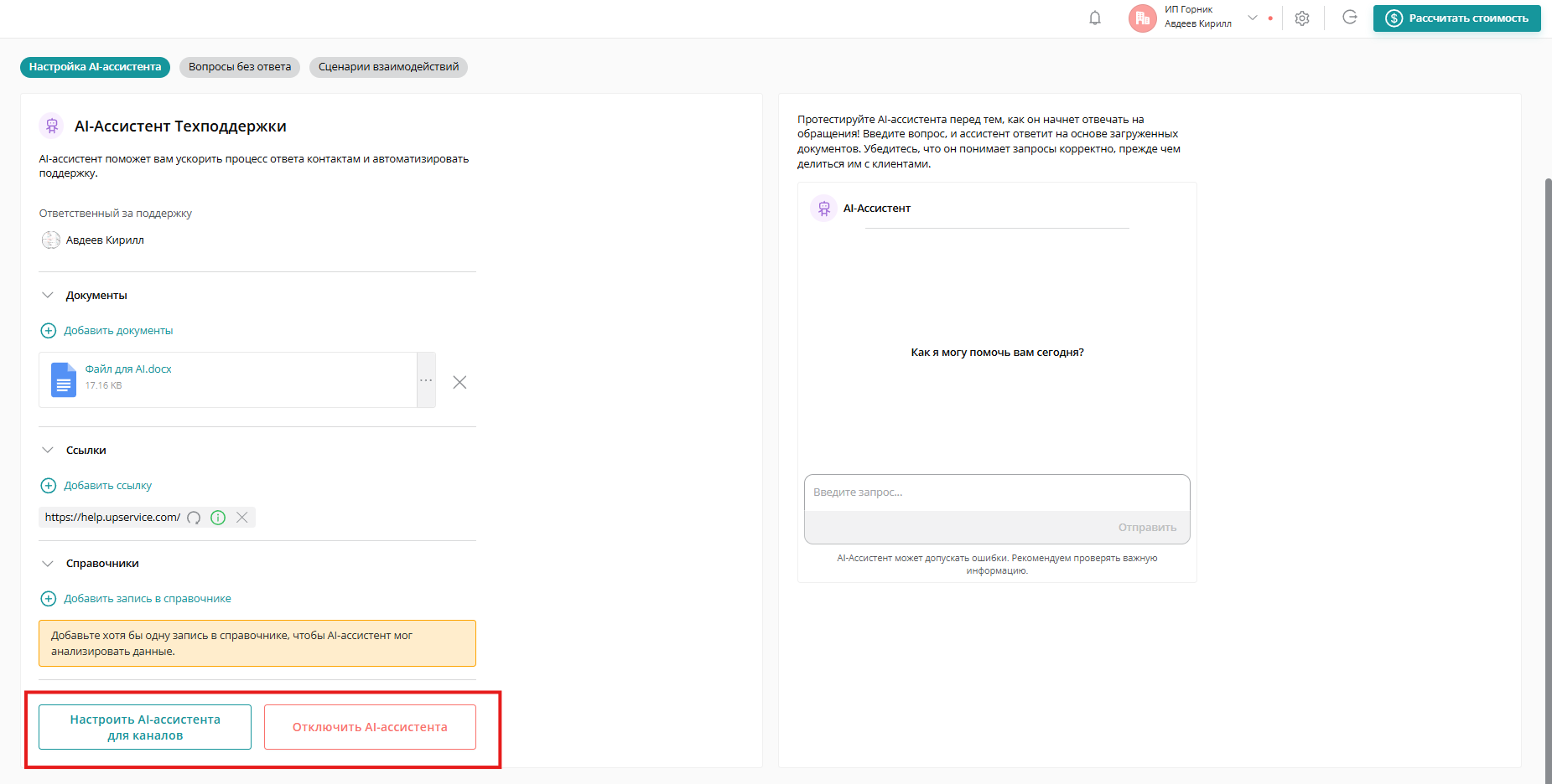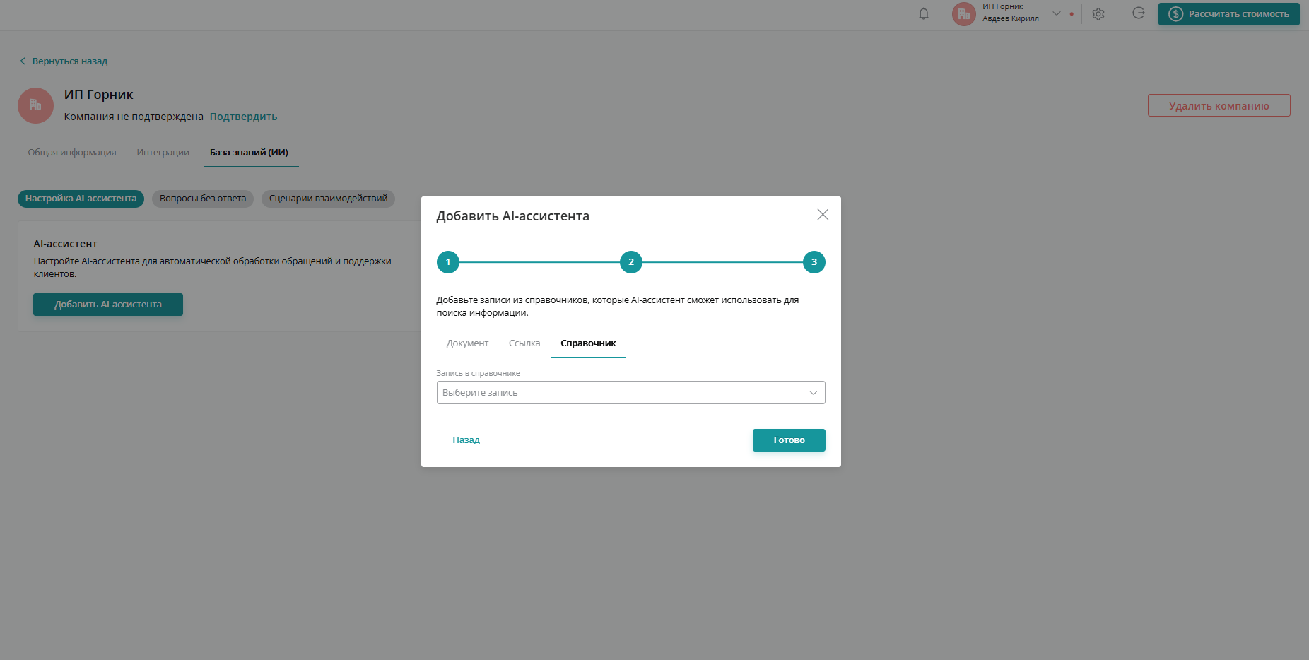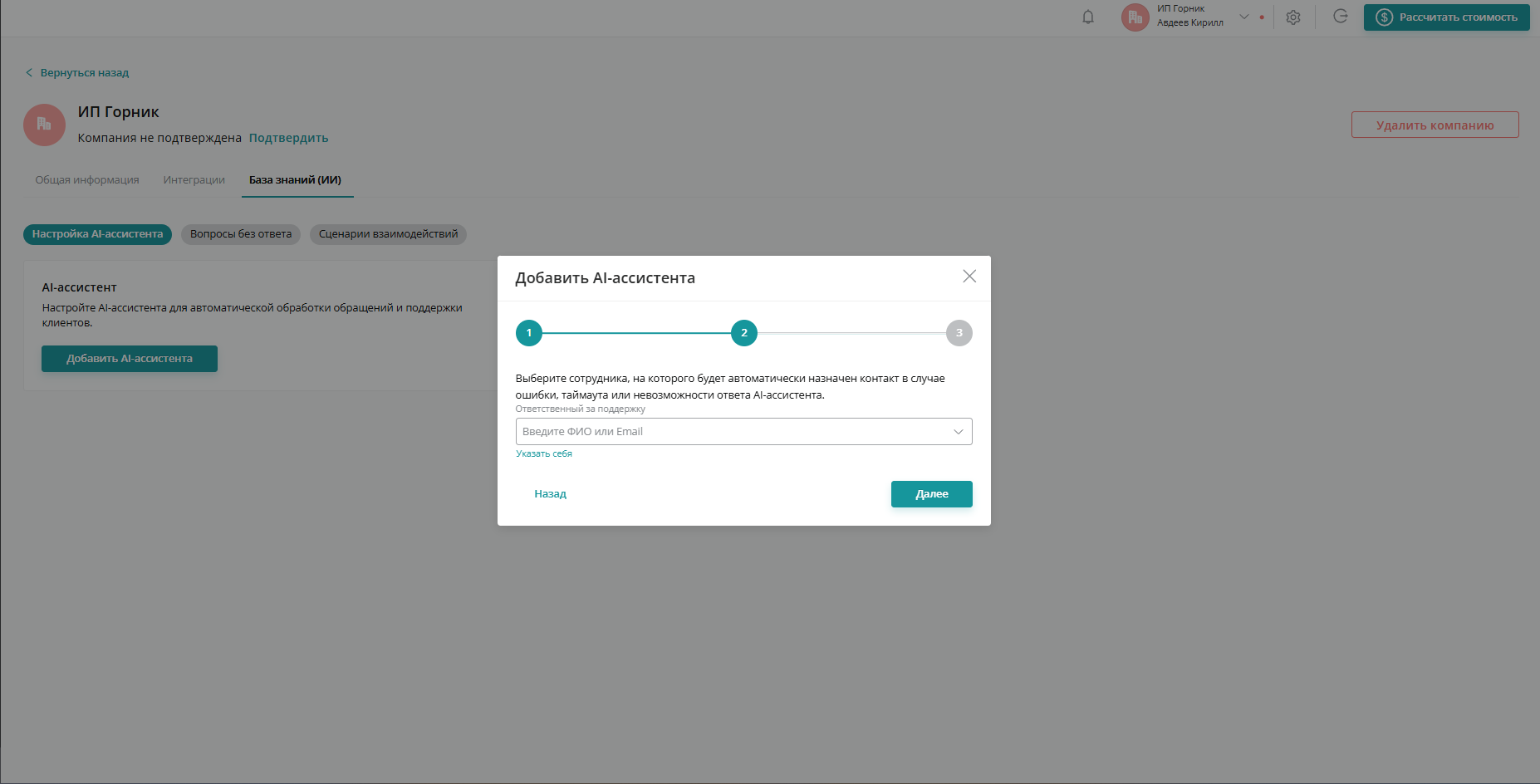 2 этапом вам необходимо назначить ответственного за поддержку, т.е оператора, на которого AI-ассистент будет переводить обращение клиента, если он не смог полностью ответить на вопрос клиента.