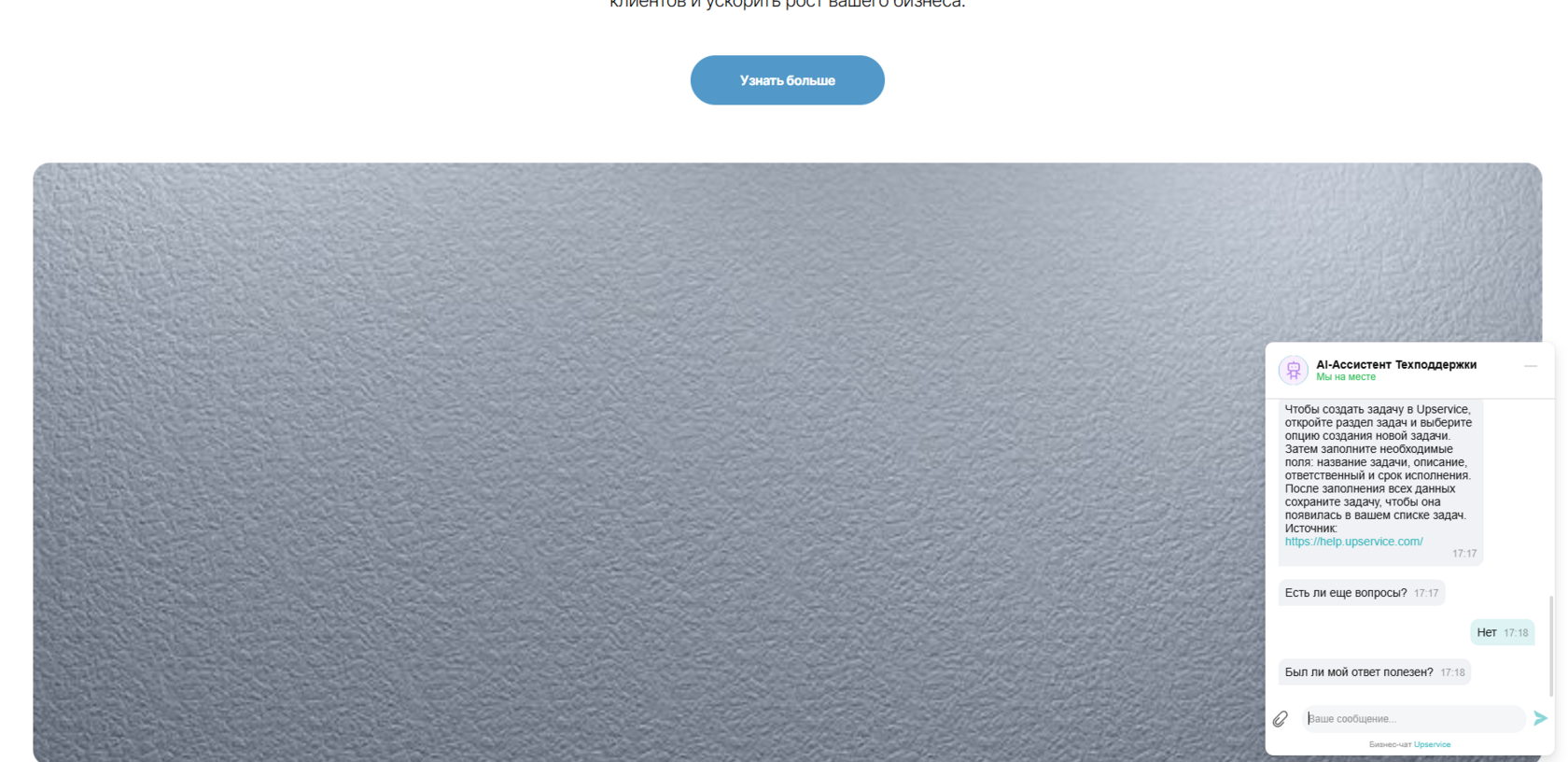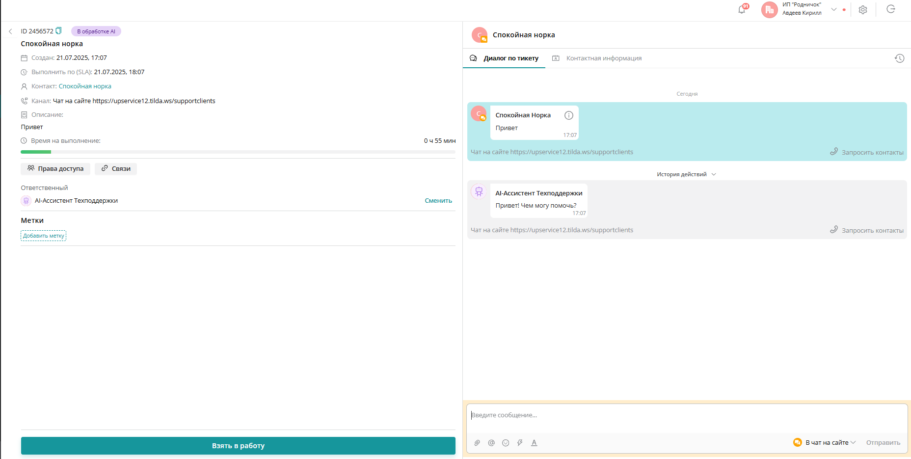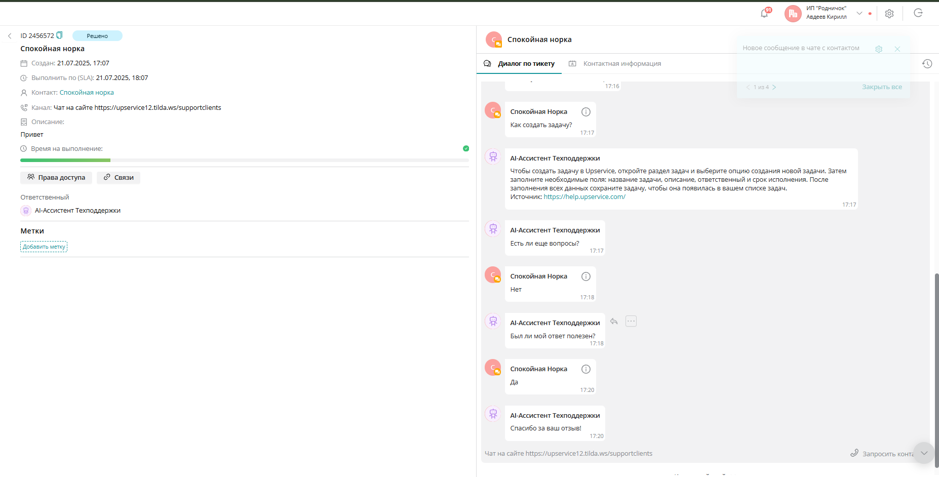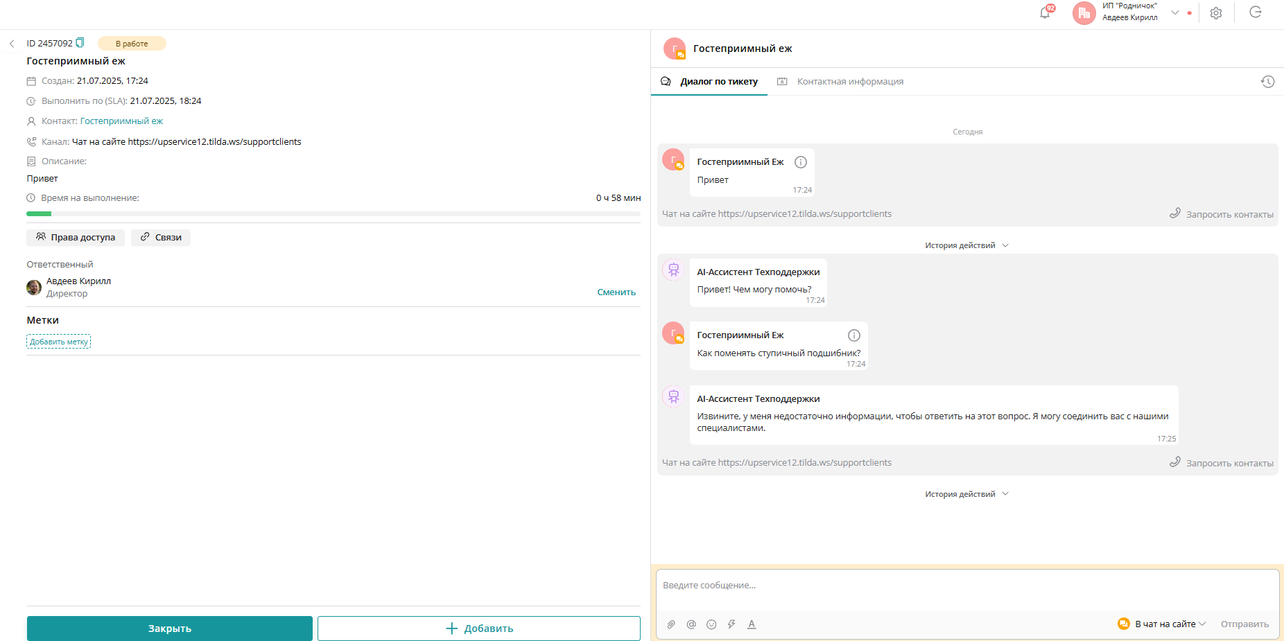 В самом Upservice АI-ассистент перевел тикет на оператора: