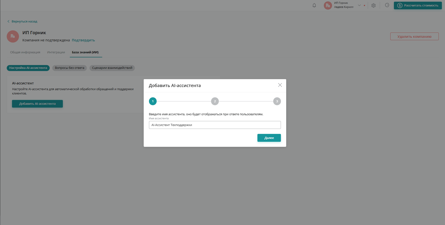 1 этапом давайте зададим название нашему AI-ассистенту. Базовым названием вам предлагается AI-Ассистент Техподдержки. После того, как вы выбрали название для вашего ассистента, нажимаем кнопку далее: