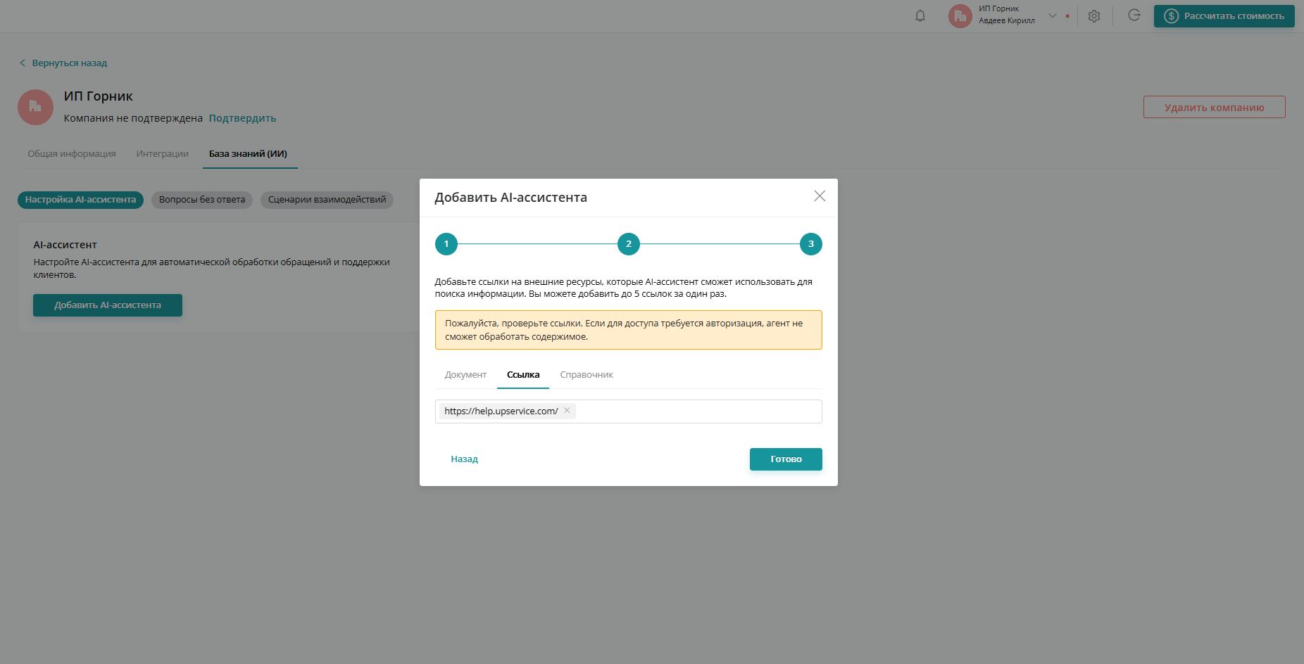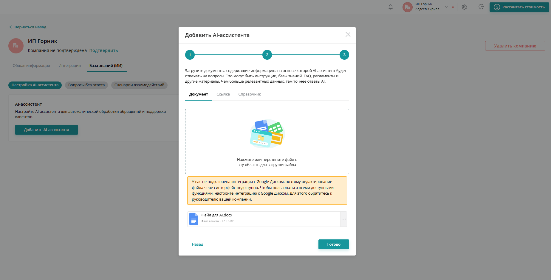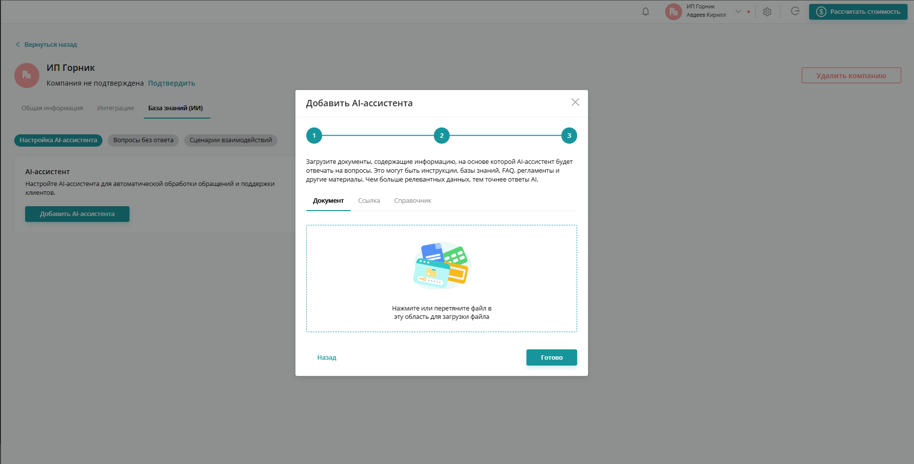 3 этапом настройки является загрузка в вашего AI-ассистента документов, ссылок или связывание с вашими справочниками, откуда AI-ассистент будет брать информацию для ответов вашим клиентам: