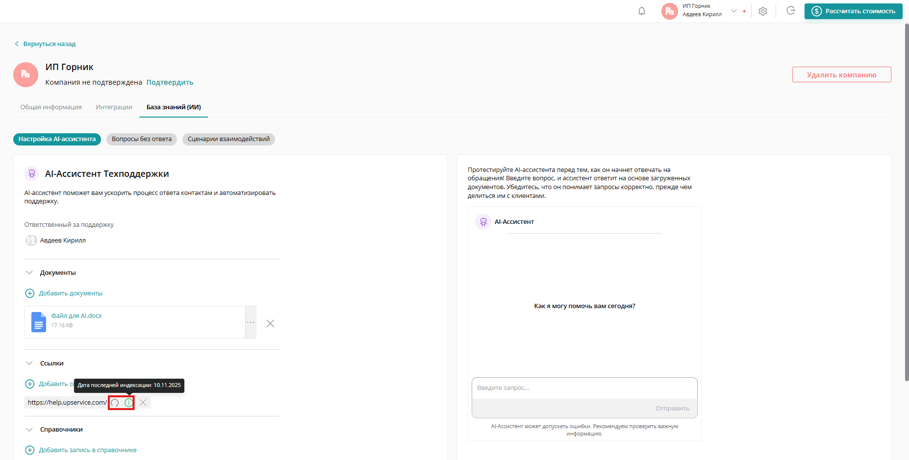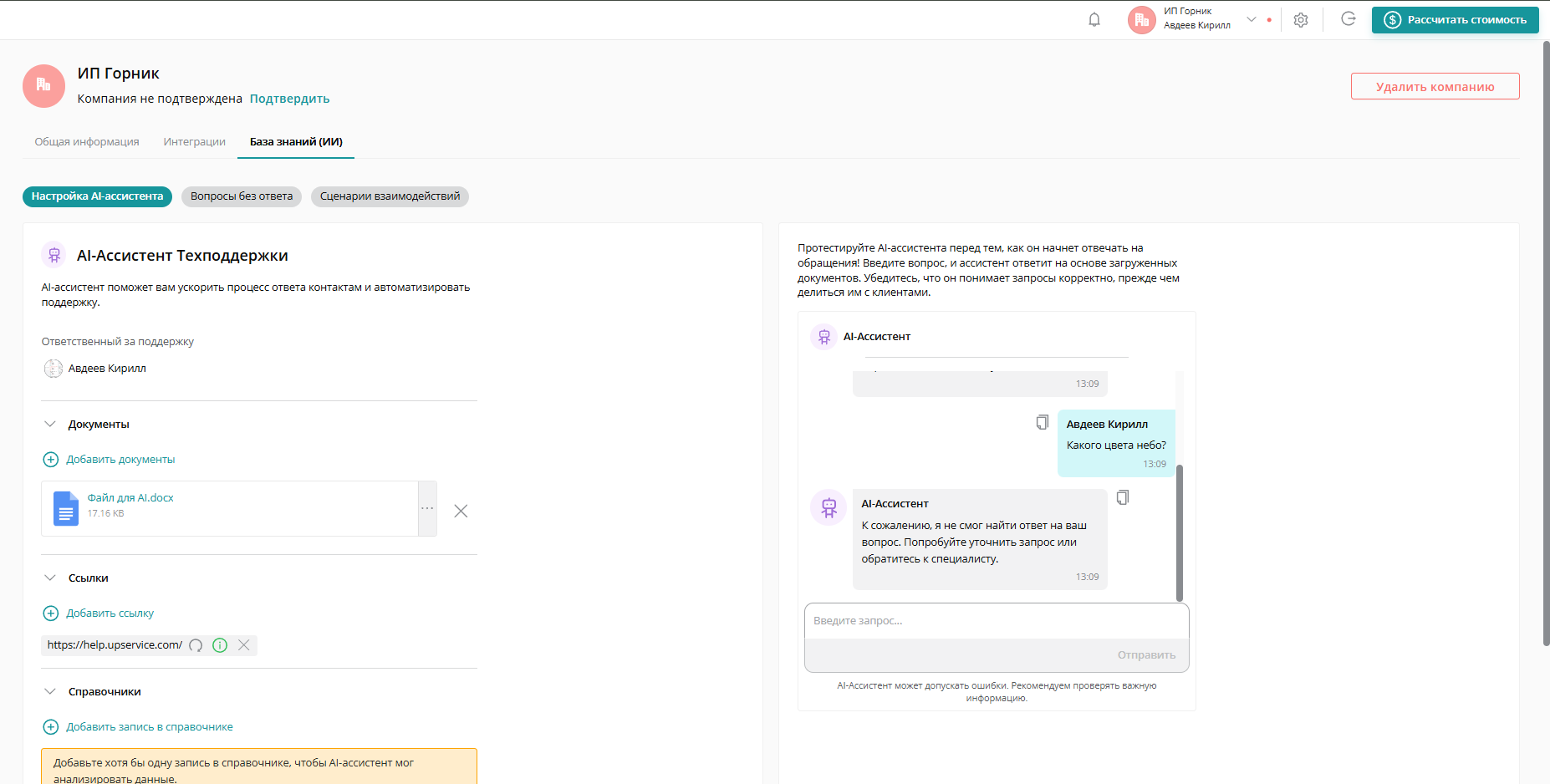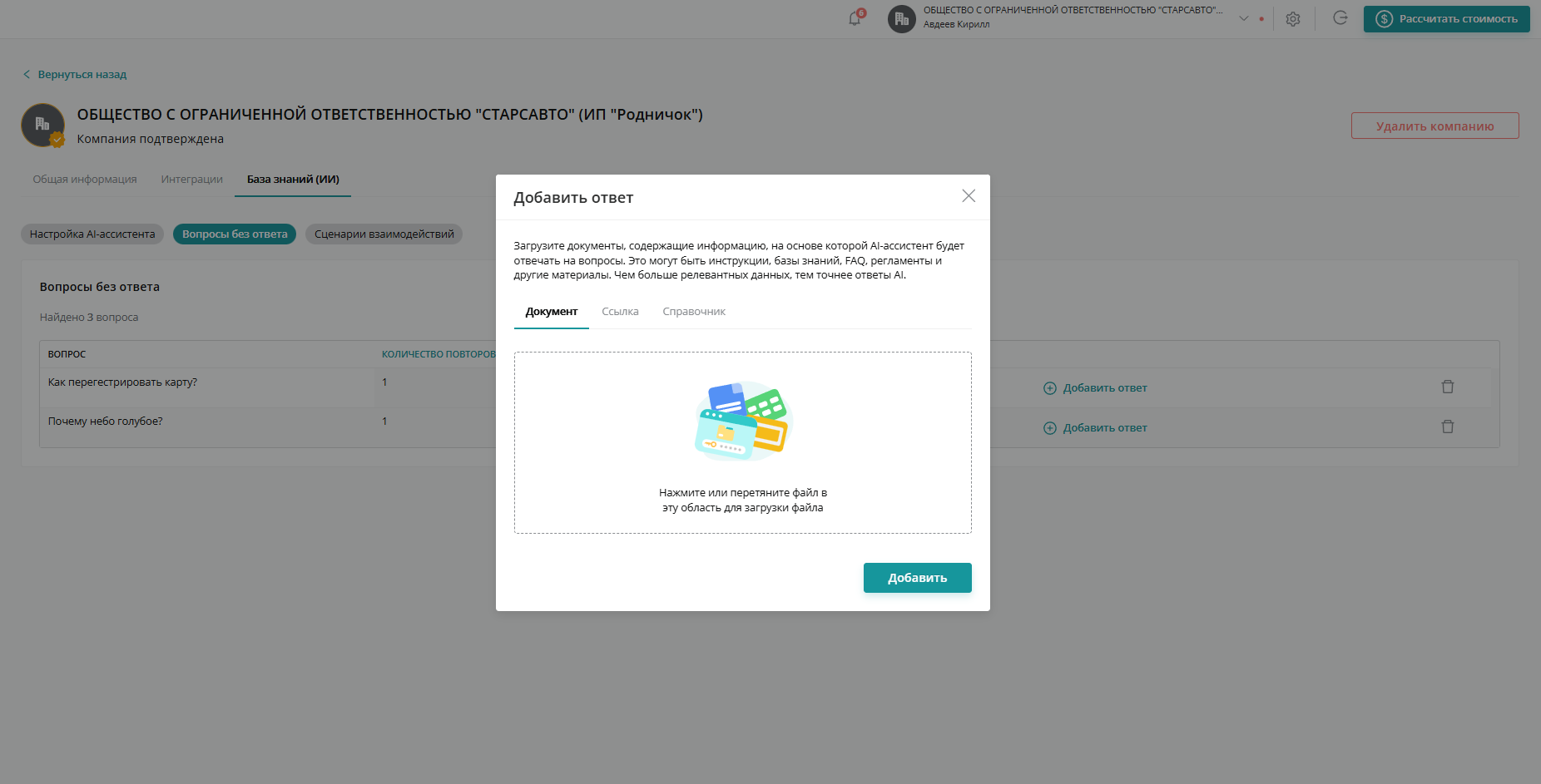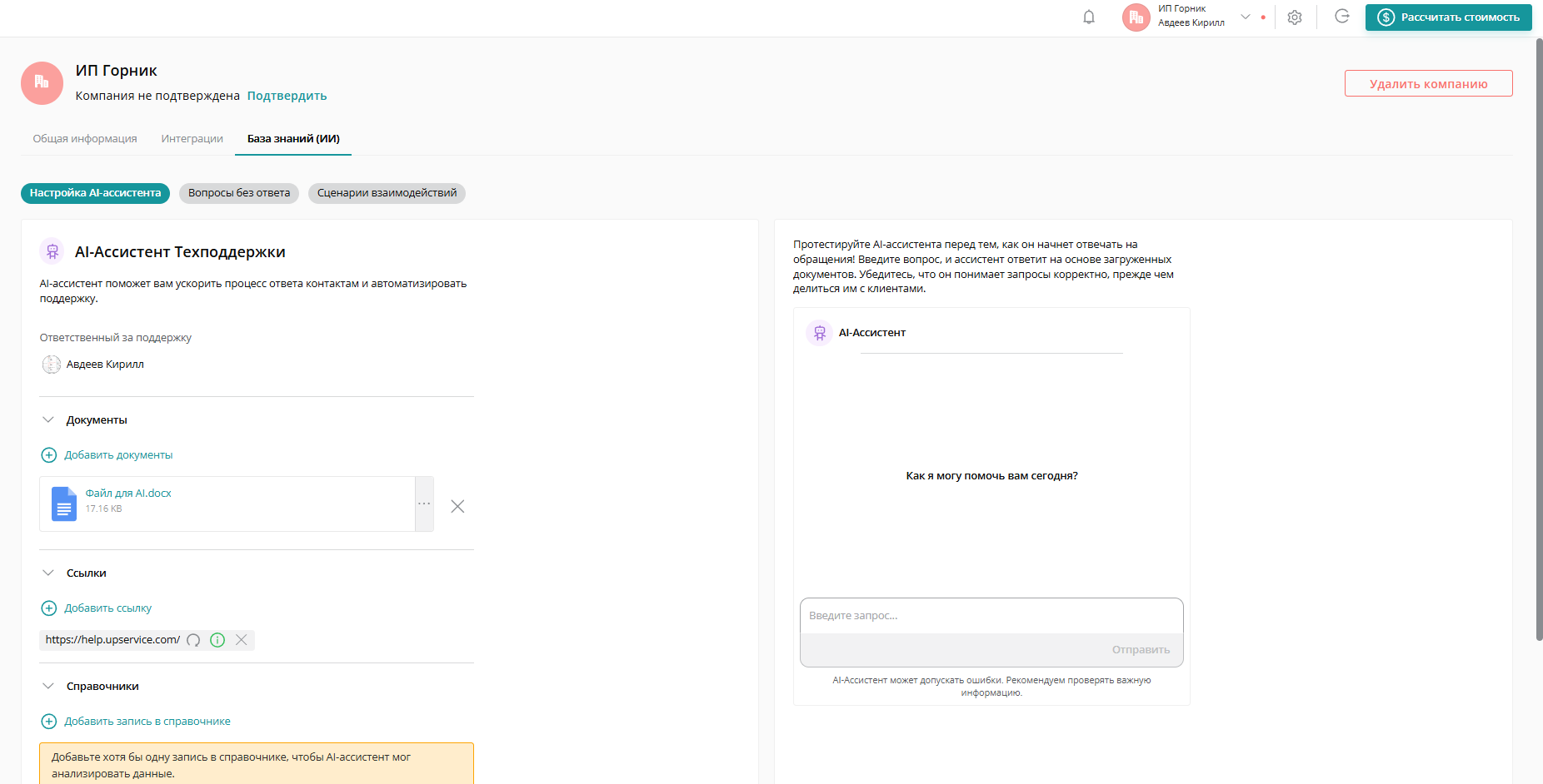 3 этапом настройки является загрузка в вашего AI-ассистента документов, ссылок или связывание с вашими справочниками, откуда AI-ассистент будет брать информацию для ответов вашим клиентам: