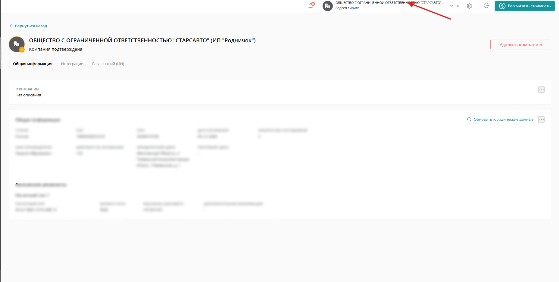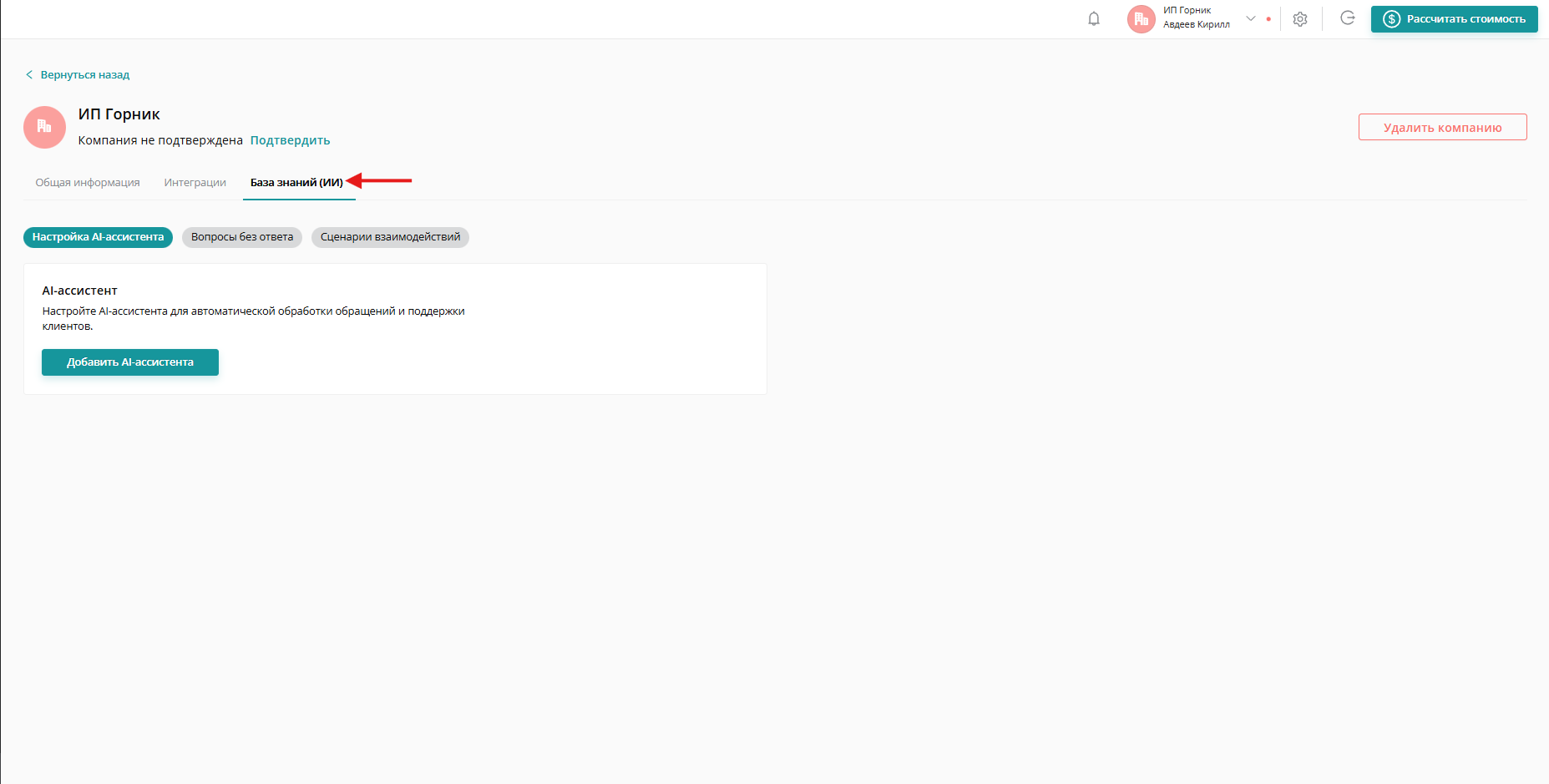 Чтобы настроить нашего AI ассистента перейдем в настройки профиля нашей компании путем нажатия на нашу компанию: