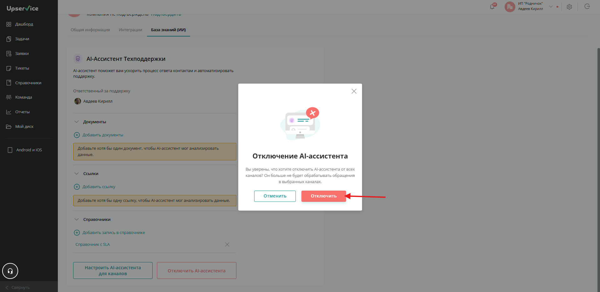 Второй случай, если вы нажмете Отключить AI-ассистента, то он перейдет в статус неактивный автоматически для всех каналов: