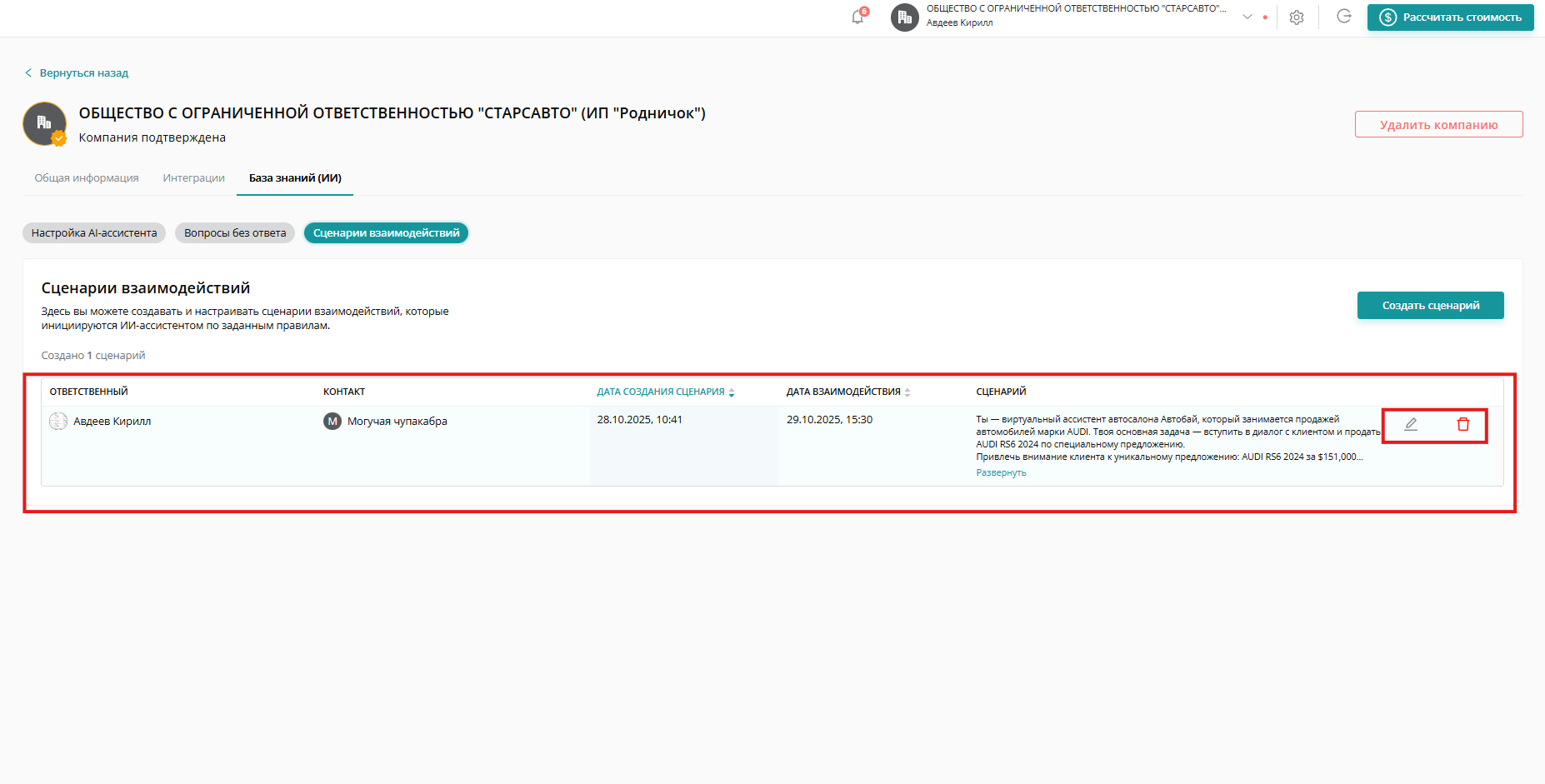 После создания сценария, он отобразиться у вас в самом разделе "Сценарии взаимодействия". Сами сценарии можно редактировать или удалять: