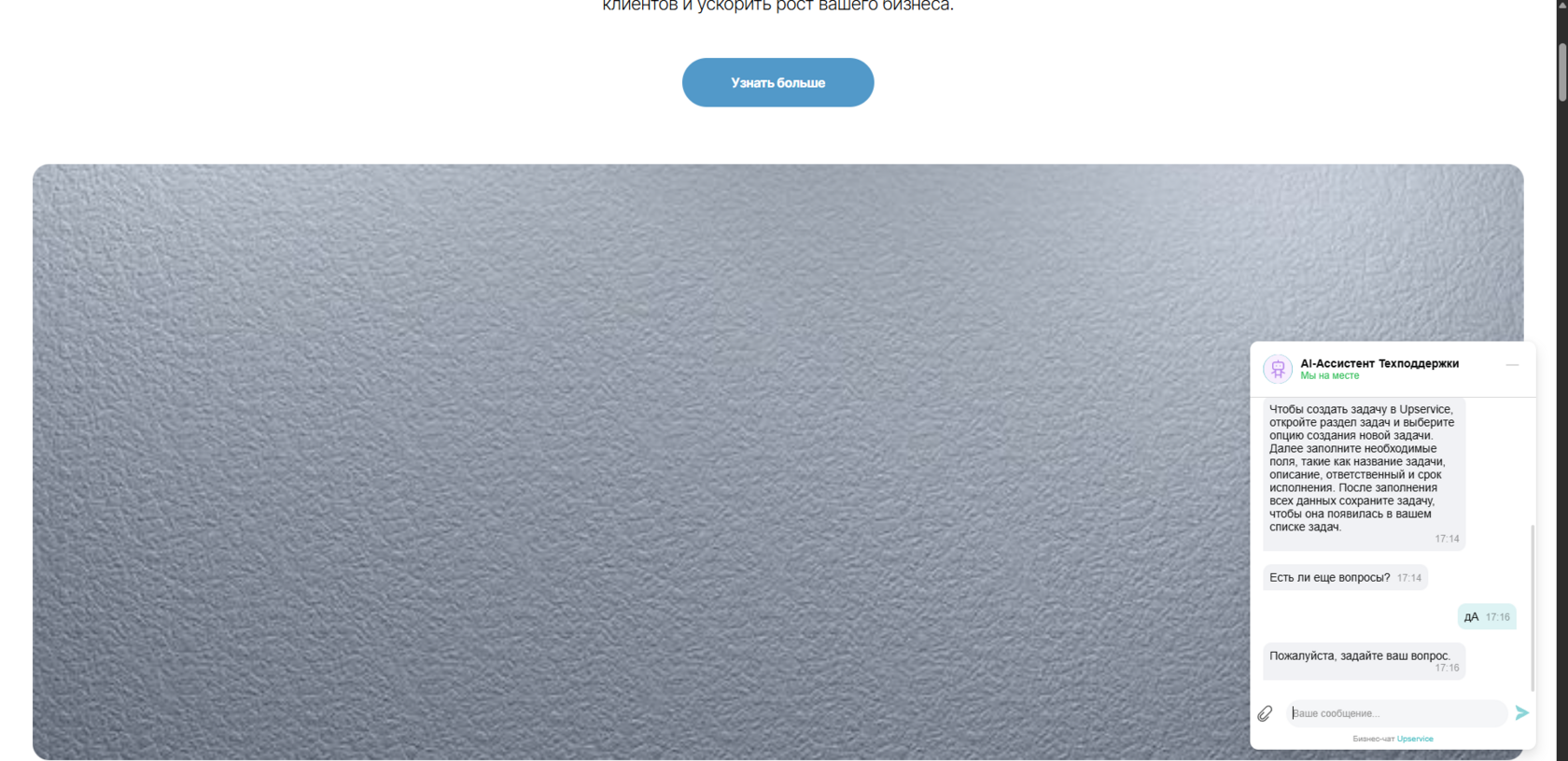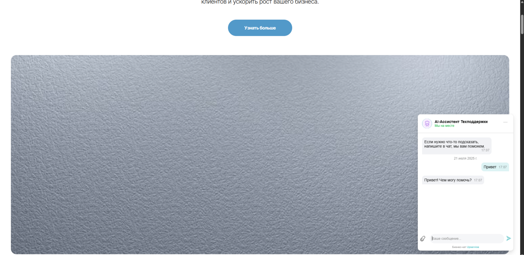 Поздравляем! Вы подключили вашего умного помощника AI-ассистента. После успешного подключения AI-ассистента в ваш канал, давайте проверим его работу написав в один из каналов, к примеру в Чат на сайте:
