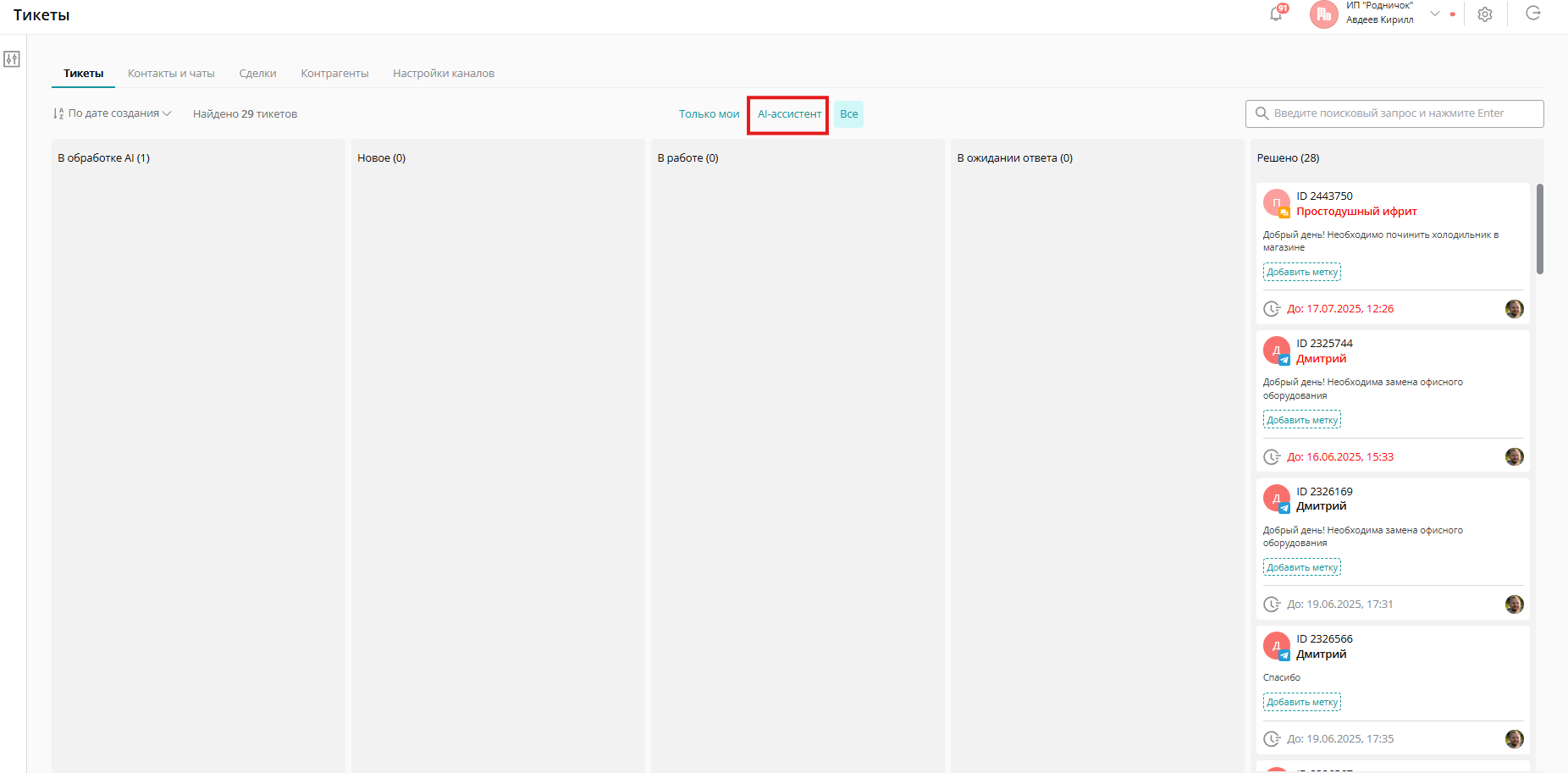 Для того, чтобы можно было быстро посмотреть, сколько тикетов смог решить сам ассистент, существует быстрый фильтр в тикетах AI-ассистент: