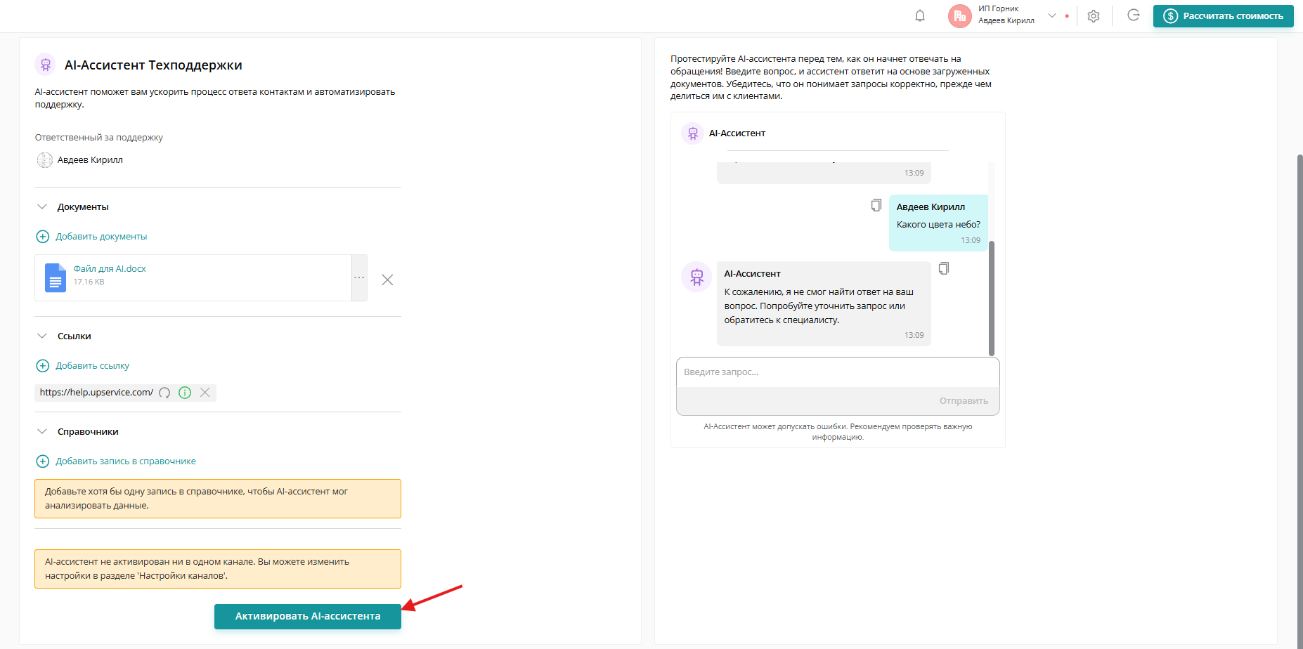 По умолчанию ваш AI-ассистент будет выключен, чтобы его включить необходимо нажать кнопку "Активировать" внизу настроек: