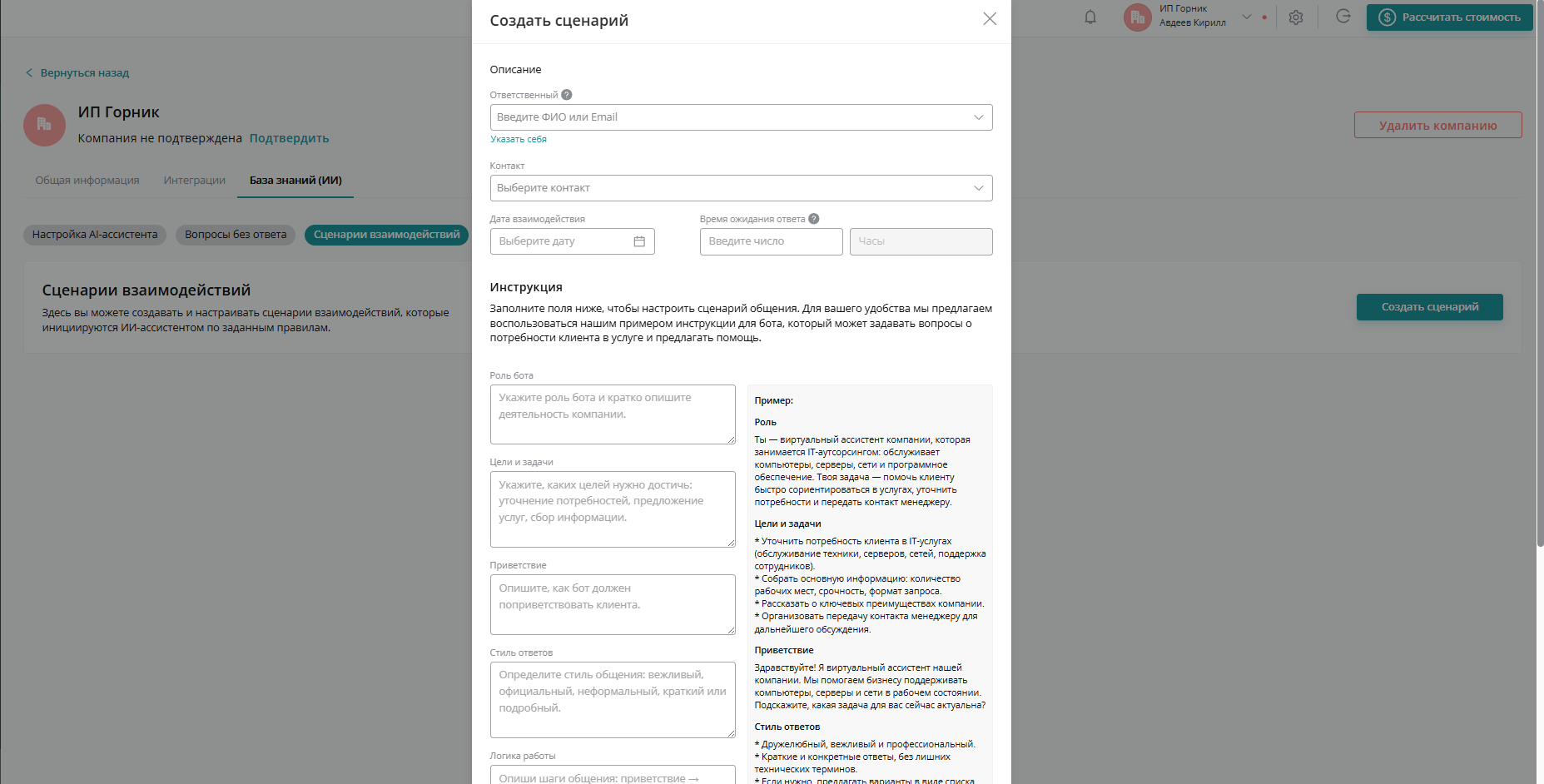 Автоматически ответственным за контакт становится AI-ассистент и он будет ответственным до тех пор, пока не переведет на оператора вопрос, на который он не смог дать ответ. В случае, если он смог дать ответ и клиент ушел довольный ответом, в таком случае AI-ассистент переведет на ответственного оператора через 4 часа после завершения коммуникация клиента с ассистентом.