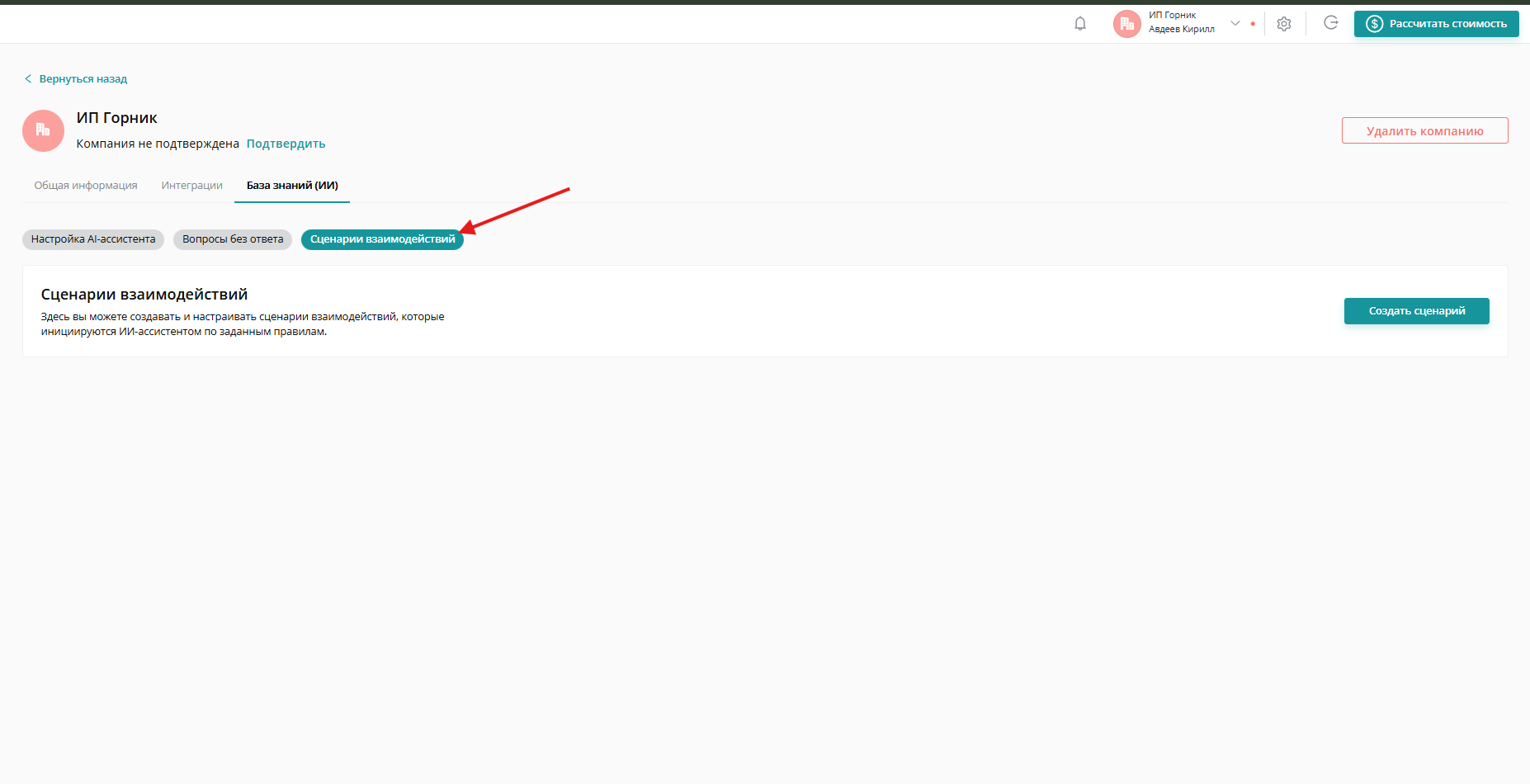 В нашей вкладке База знаний выбираем 3 подвкладку "Сценарии Взаимодействия"
