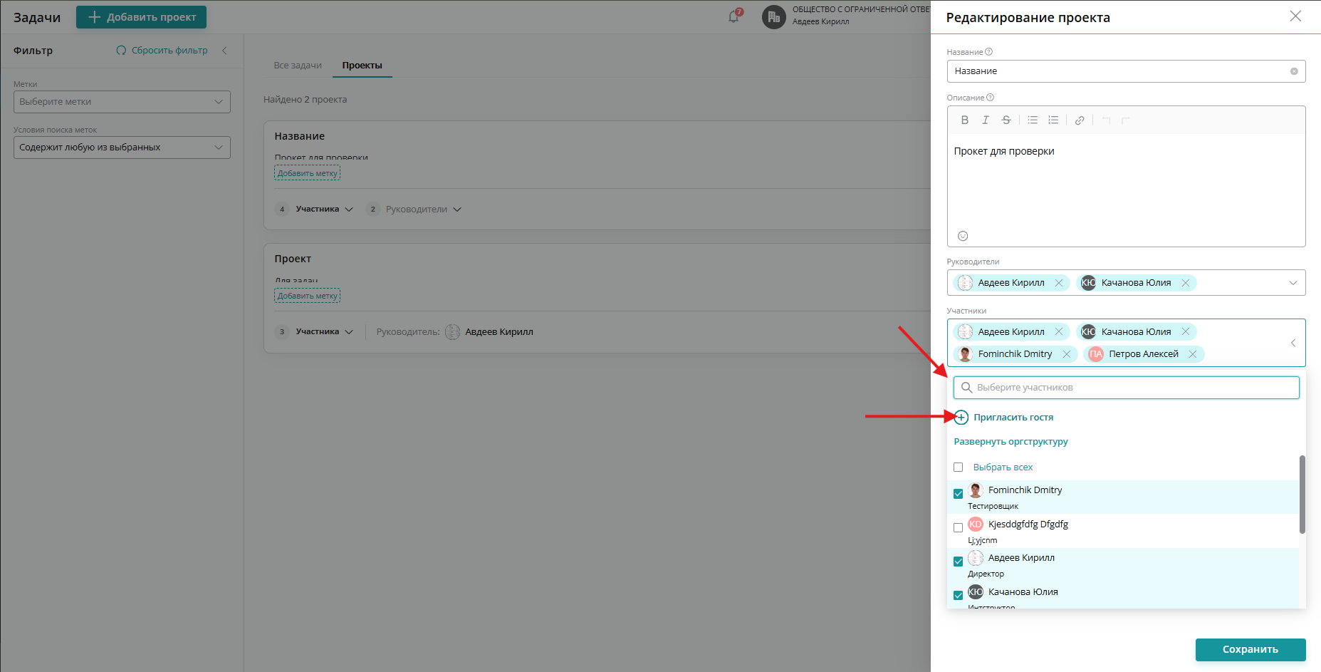 При создании или редактировании проекта , вам необходимо в поле «Участники» выбрать функцию пригласить гостя: