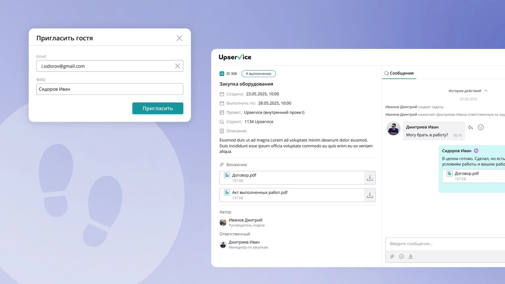Таким образом вы можете пригласить незарегистрированных пользователей напрямую в задачу, либо сотрудников из другой компании, которые зарегистрированы в Upservice.