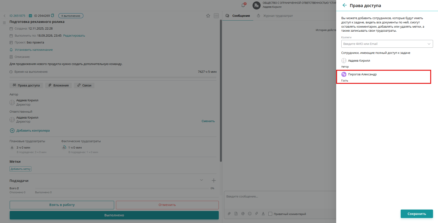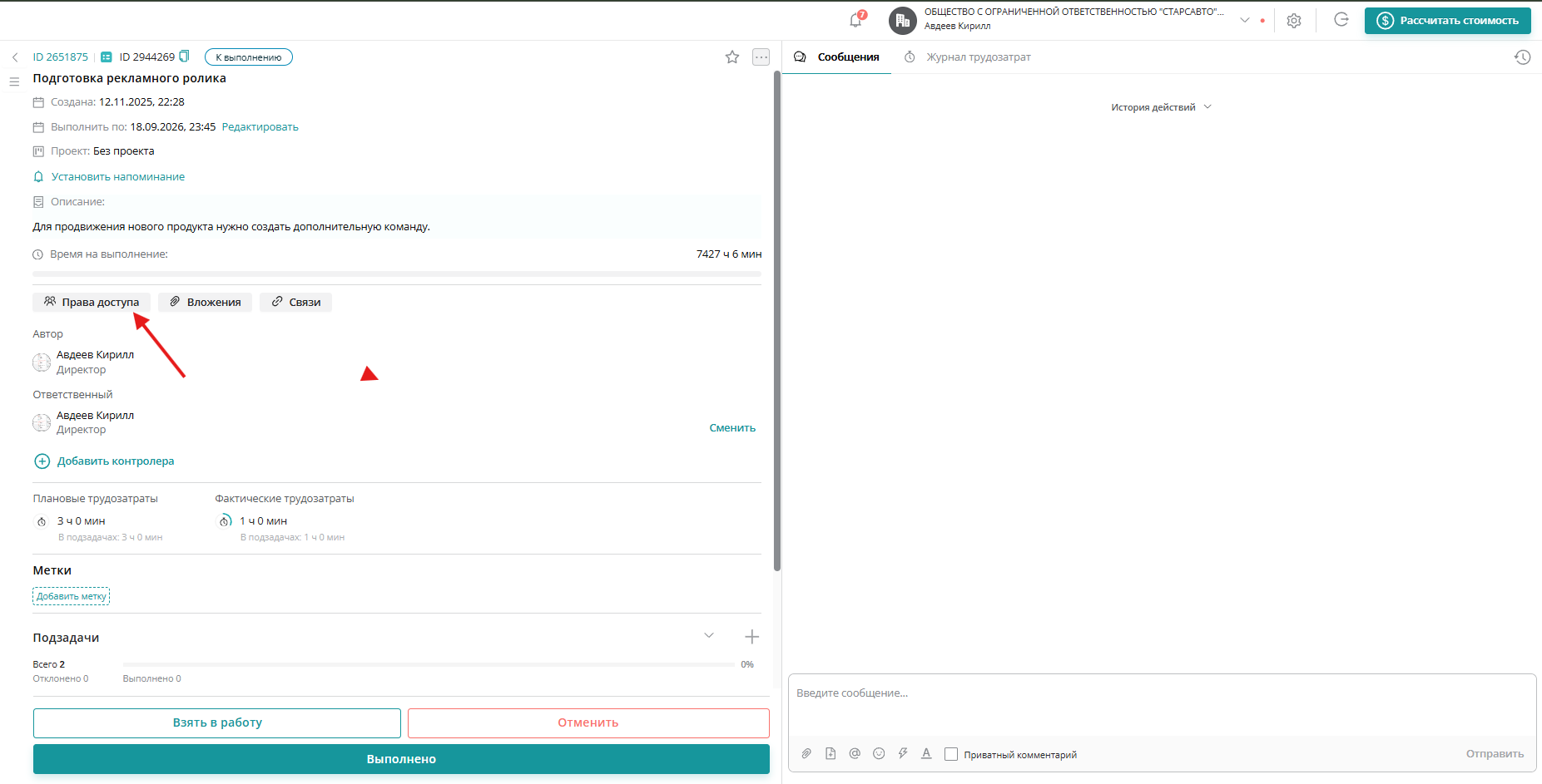 Для того, чтобы вы могли пригласить участника в задачу напрямую — необходимо перейти в саму созданную задачу и найти вкладку "Права доступа". Например мы хотим дать доступ просматривать статус задачи, которую мы завели на основе обращения другого клиента, но проблема общая. Для этого переходим в нашу задачу и открываем "Права доступа":