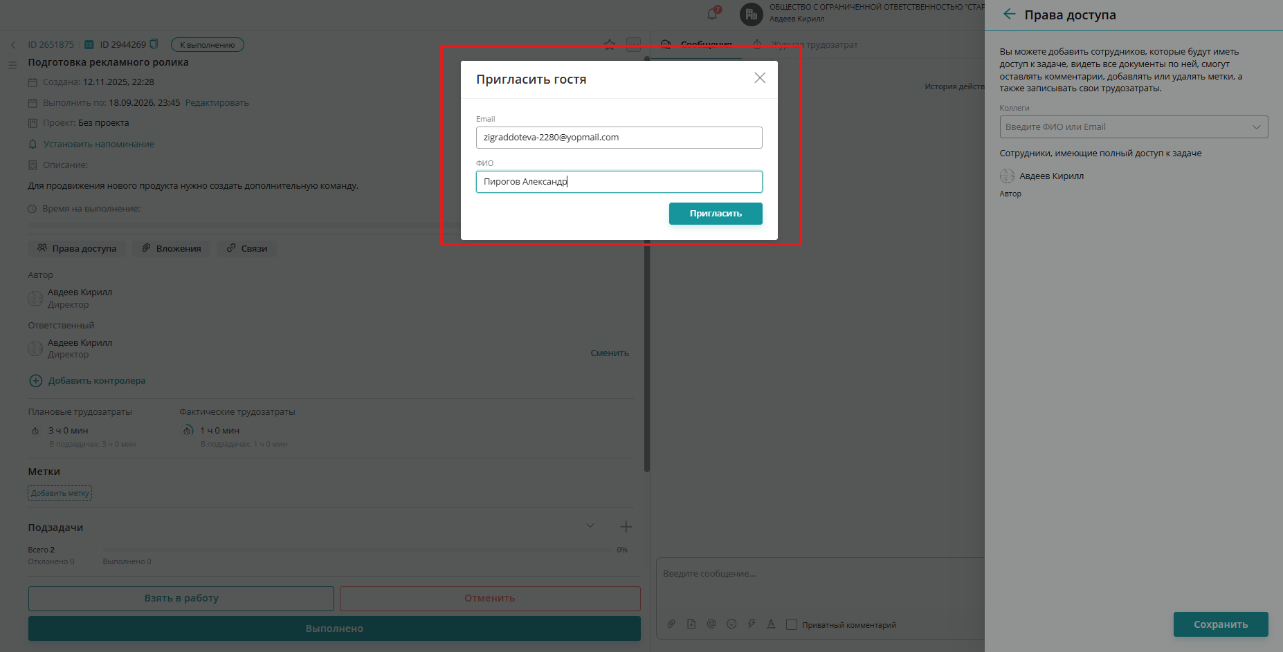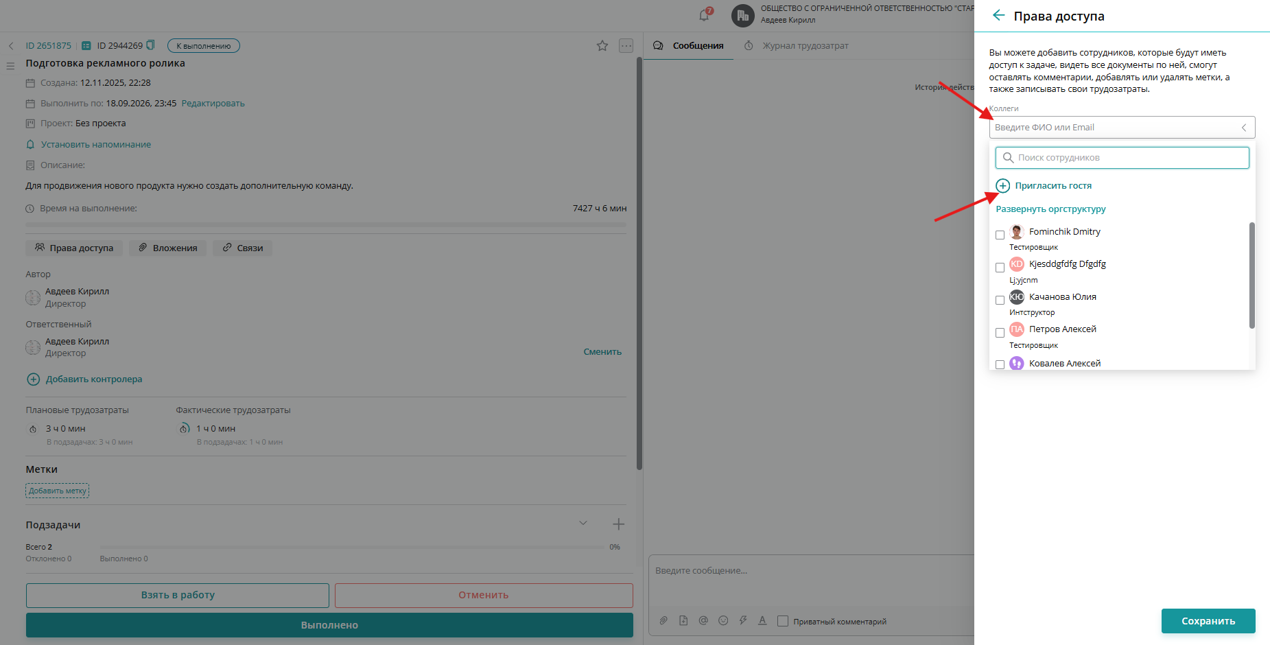 После того, как мы открыли Права доступа — нажимаем на поле коллеги и видим нашу функциональность "Пригласить гостя":