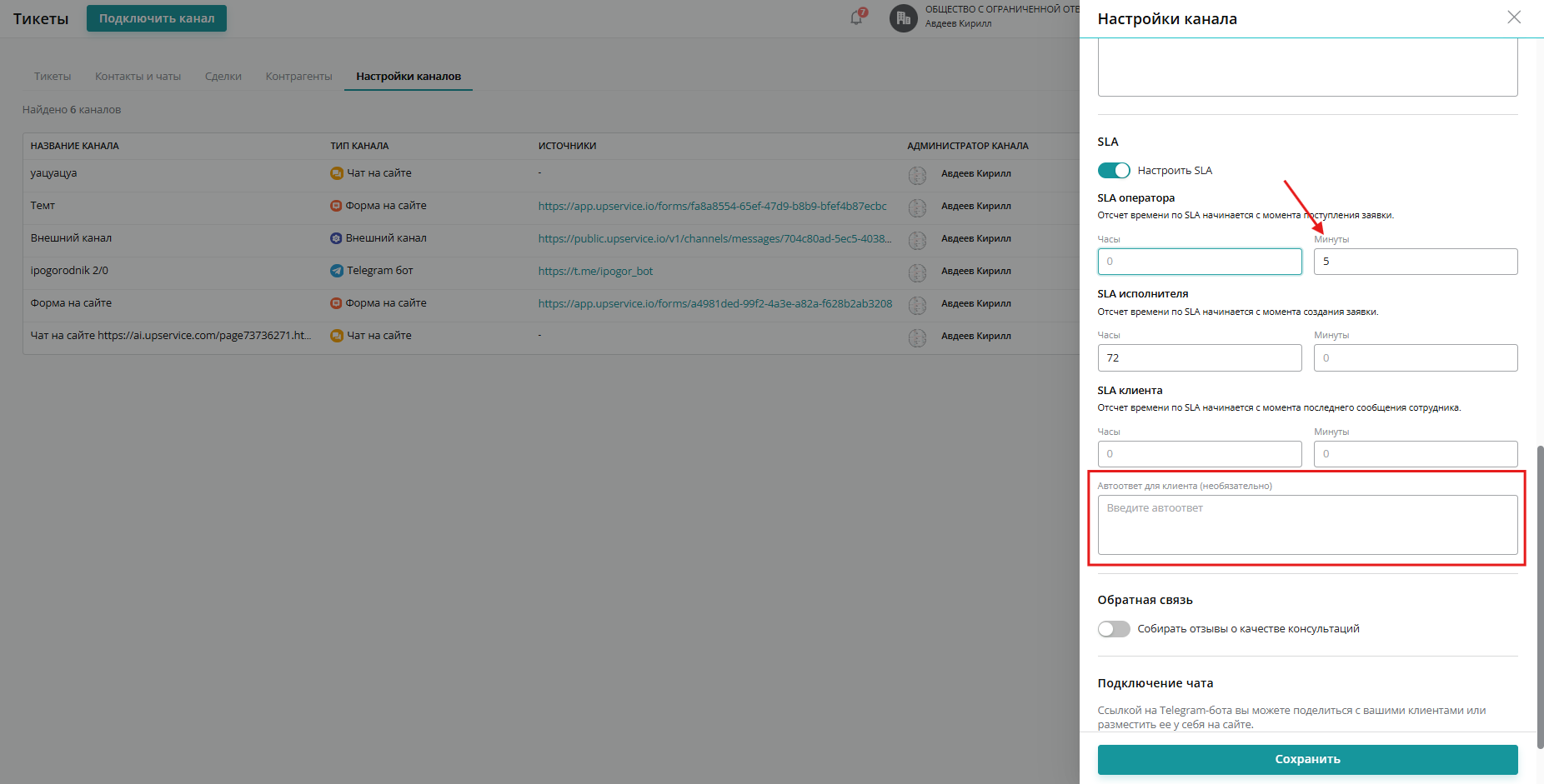 Автоответ для клиента - автоответ отличная функция для тех, у кого постоянный наплыв обращений от клиентов и могут не успеть обрабатывать все сразу. Автоответ отправится автоматически после сообщения клиента , через то количество времени, которое укажите вы. Зависит оно от времени SLA оператора. Поставим к примеру SLA оператора 5 минут.