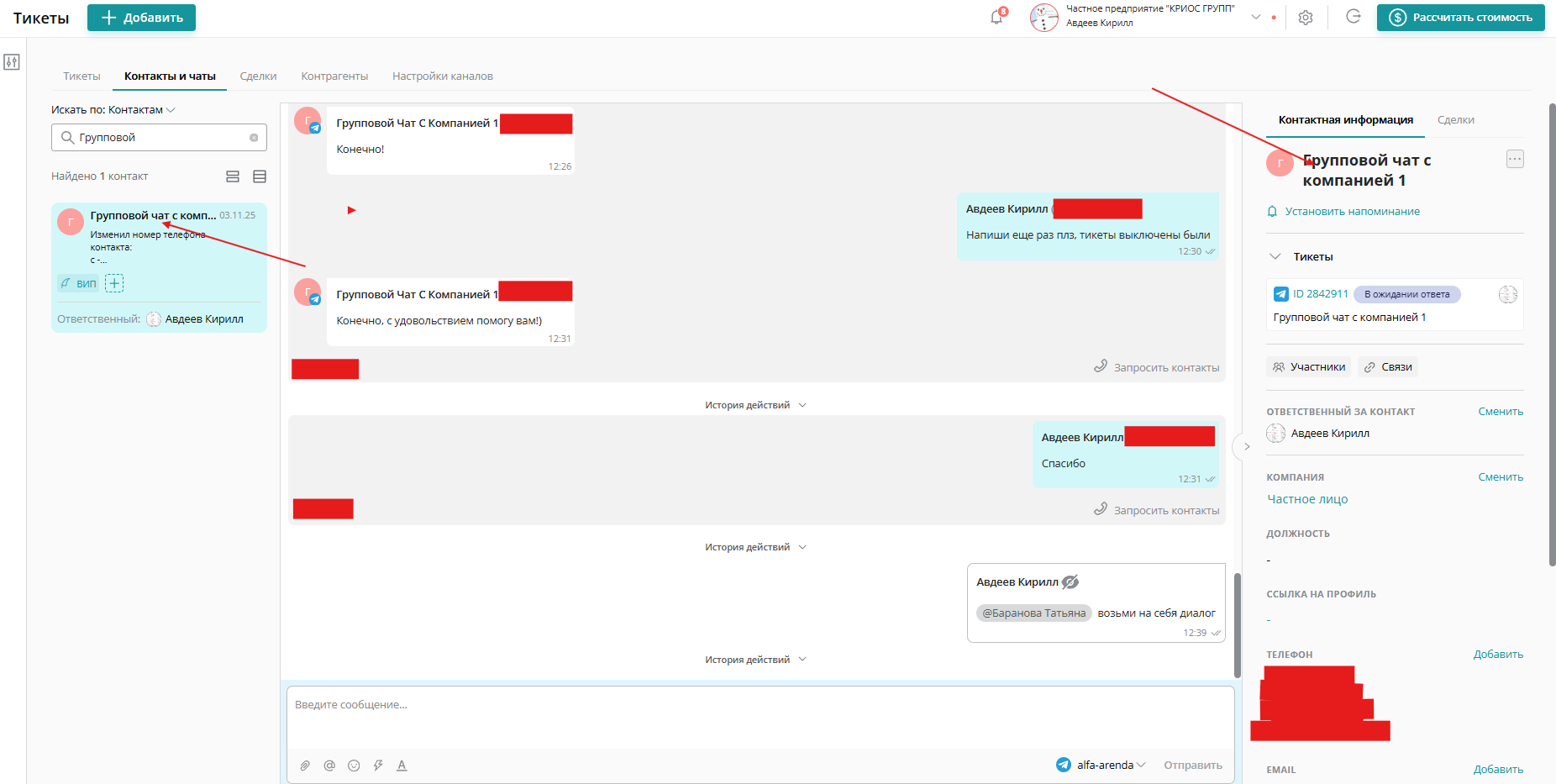 Сразу после этого в Upservice будет создан новый контакт, которому присвоится имя того человека, который написал сообщение в группе Telegram. Чтобы не возникало путаницы стоит переименовать данный контакт в Upservice вручную, задать ему имя — в соответствии с названием Telegram группы: