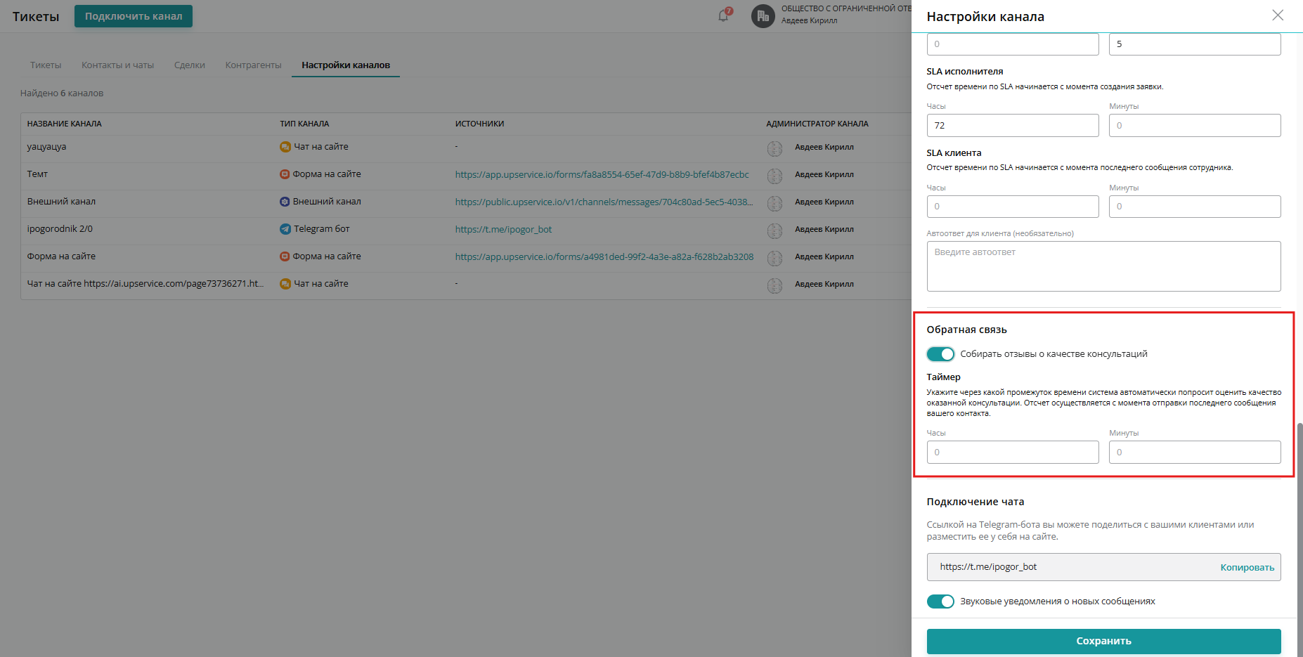 Для этого активируйте ползунок "Собирать отзывы о качестве консультаций" и укажите время, через какой промежуток времени система автоматически попросит оценить качество оказанной консультации.