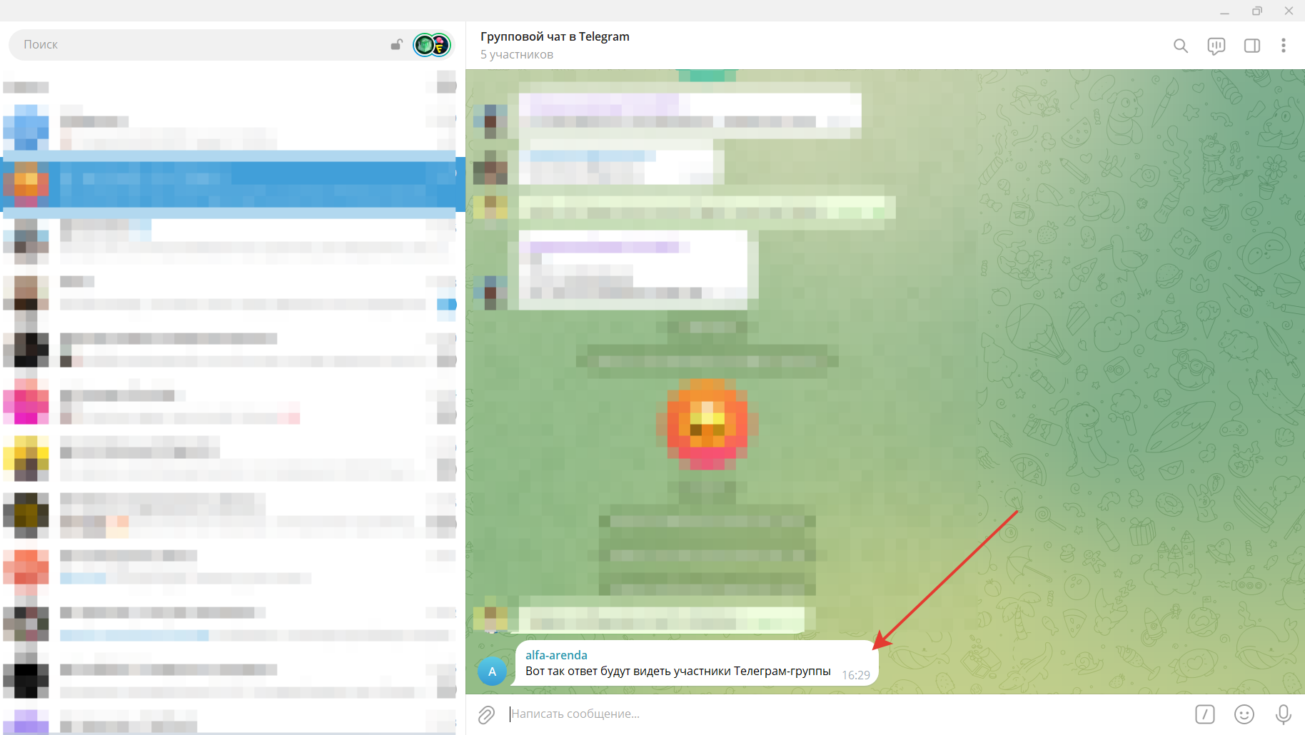 г) Но, чтобы работать в групповым чатом было удобно, нужно выполнить еще пару косметических действий. А именно, написать сообщение в телеграм группе и дождаться когда оно отобразится в Upservice.
