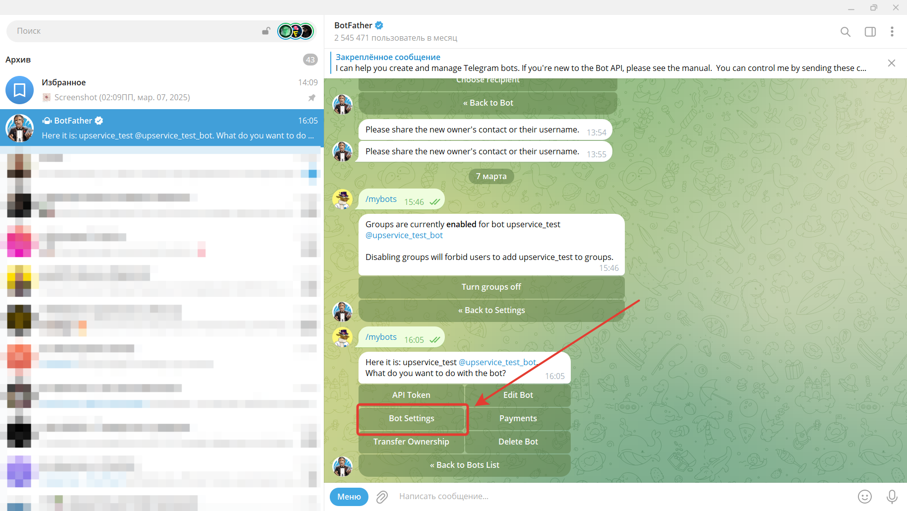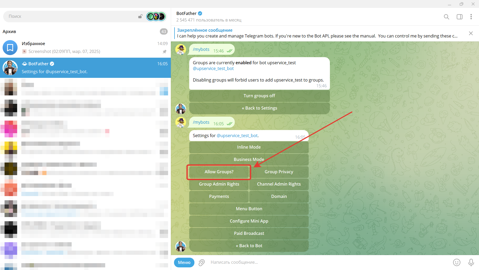 Если вам необходимо, чтобы сообщения из групповых чатов (Телеграм-групп) поступали в Upservice выполните следующие шаги: