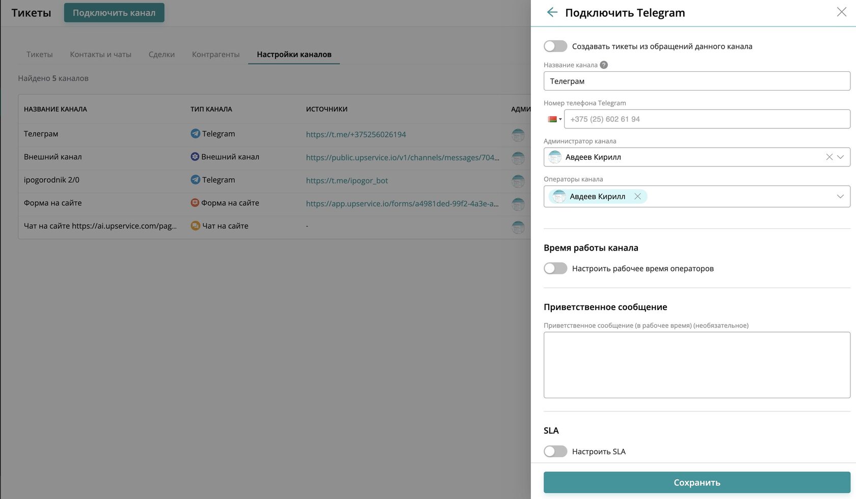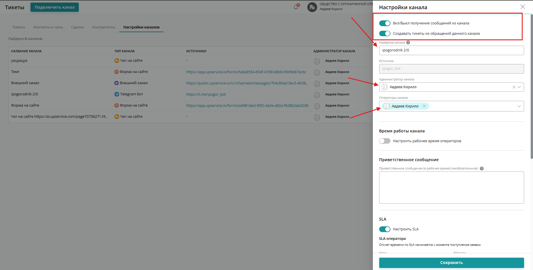 На следующем этапе необходимо указать название канала, выбрать администратора канала (им может быть только один сотрудник) и операторов (можно назначить любое число сотрудников, именно они будут отвечать на сообщения пользователей), также активировать либо деактивировать ползунки о получении сообщений и создании тикетов по данному каналу: