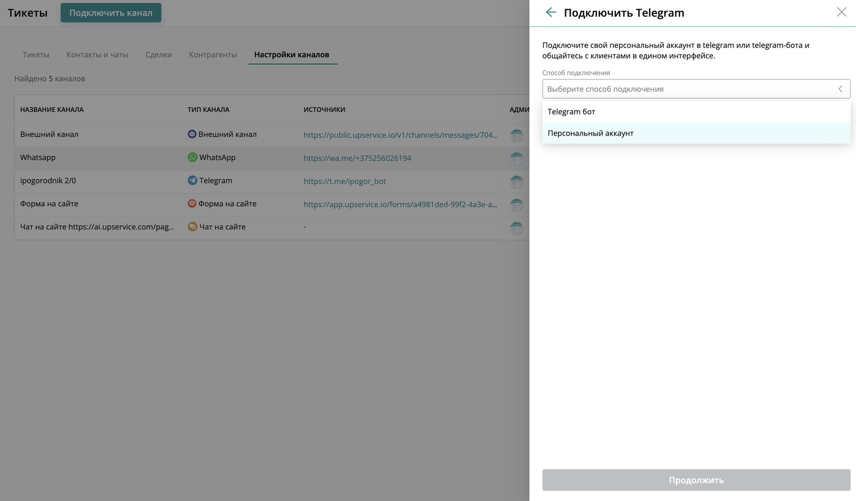 После создания бота в Telegram его необходимо подключить в Upservice. Для этого зайдите в раздел «Тикеты», перейдите во вкладку «Настройки каналов», нажмите кнопку «Подключить канал» и выберите канал «Telegram» и в способе подключения выберите Telegram-бот: