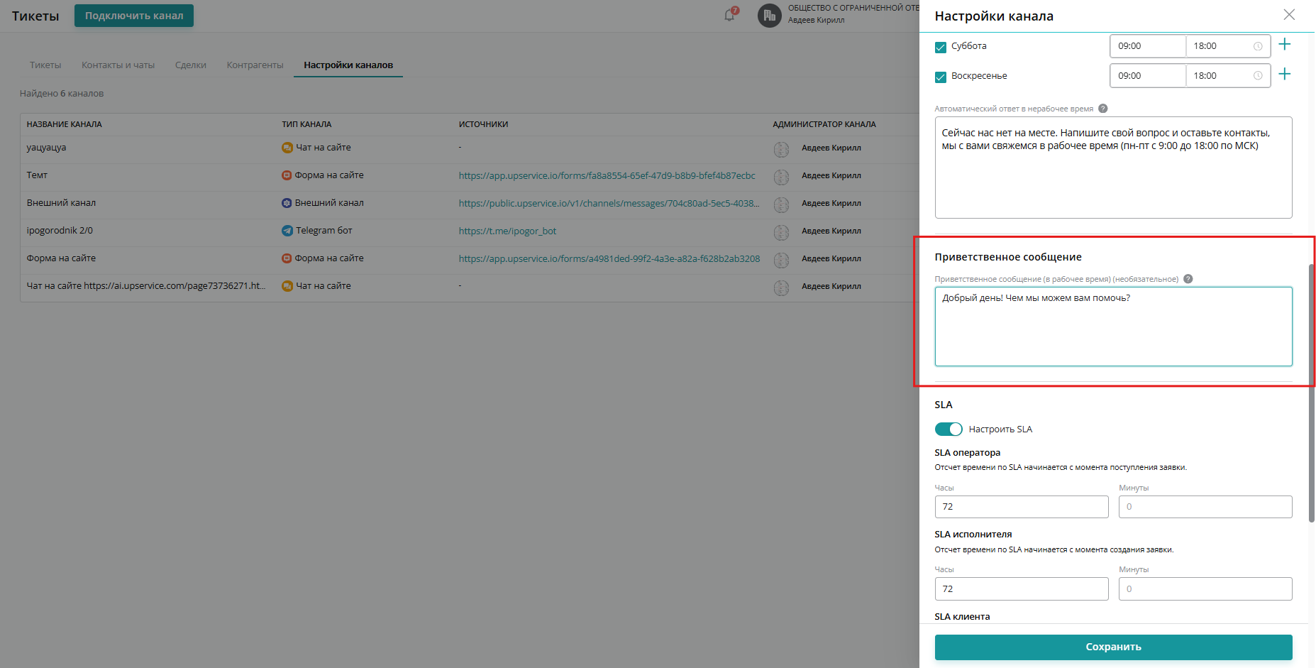 Следующий шаг настройки Телеграм — добавление Приветственного сообщения (это будет первое сообщение, которое увидит клиент после начала диалога в Telegram):