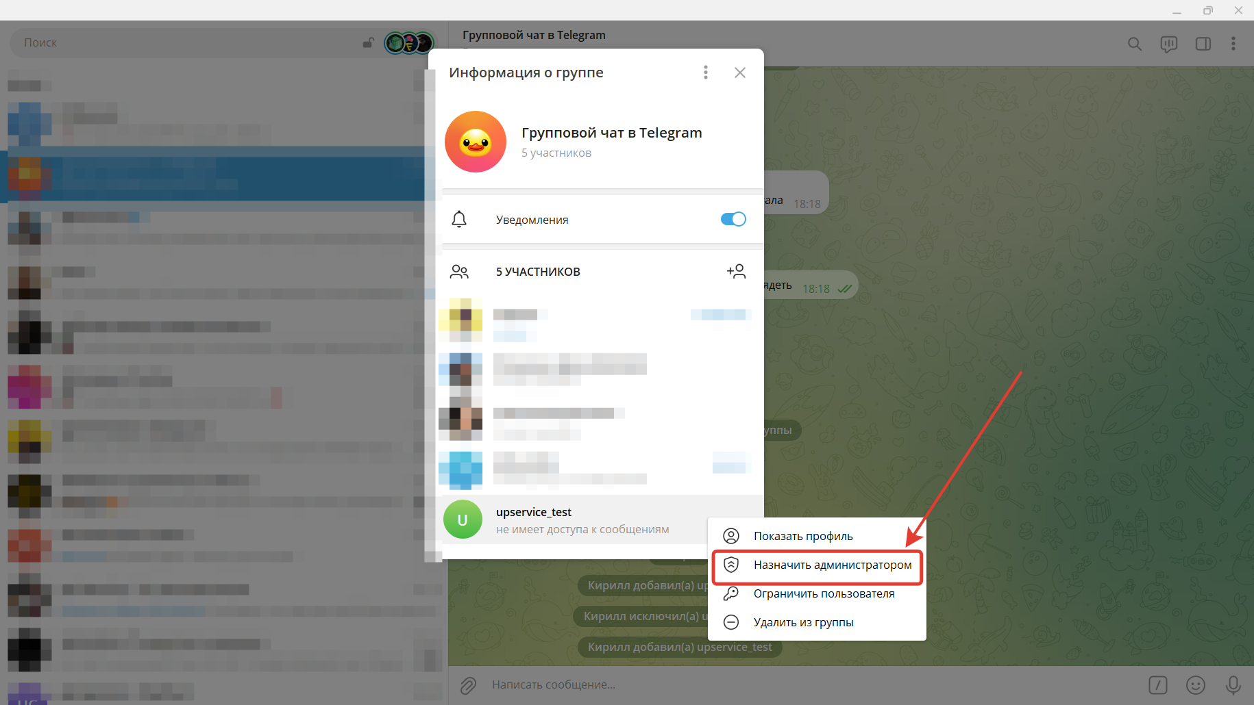в) Назначьте бота Администратором группы (клик по названию группы → клик по имени бота в списке участников правой клавишей мышки → Назначить администратором):