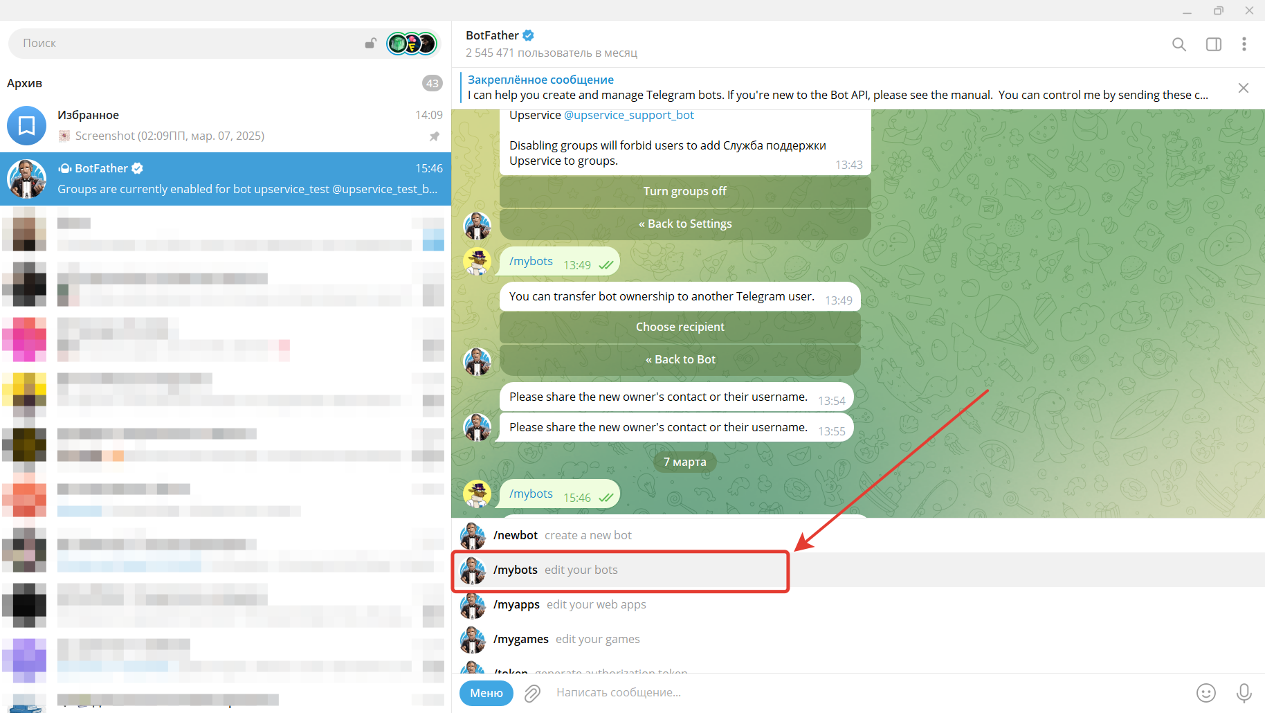 Далее нажмите на кнопку «Меню» и выберите вторую строку «/mybots edit your bots»: