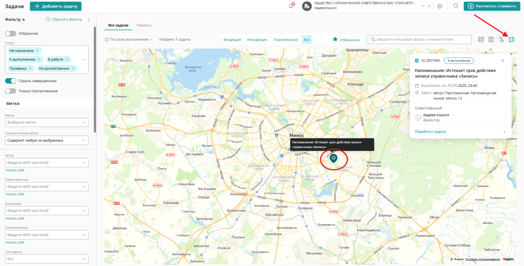 Если результат выполнения задачи не устраивает, контролер может отправить задачу на доработку, нажав на кнопку «Вернуть в работу». В таком случае задача вернется к ответственному и получит статус «К выполнению».