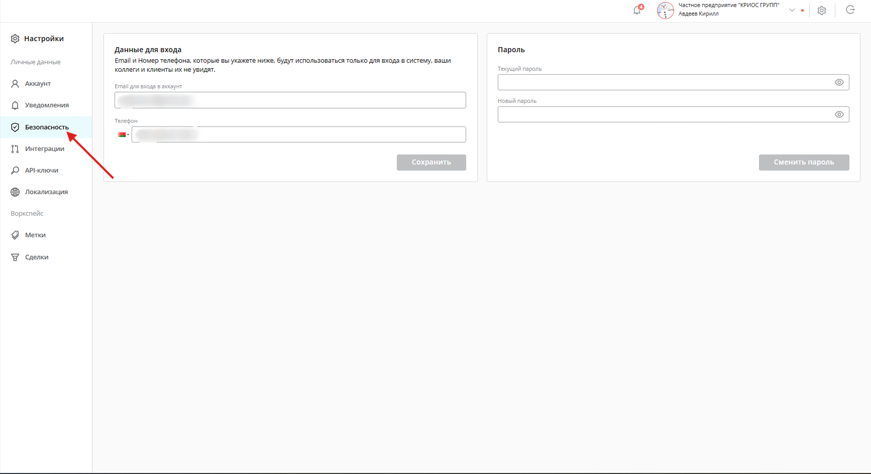 В данном разделе вам доступны для изменения Данные для входа в систему, а именно Email для входа в аккаунт, Телефон и в этом же разделе находится Смена пароля.